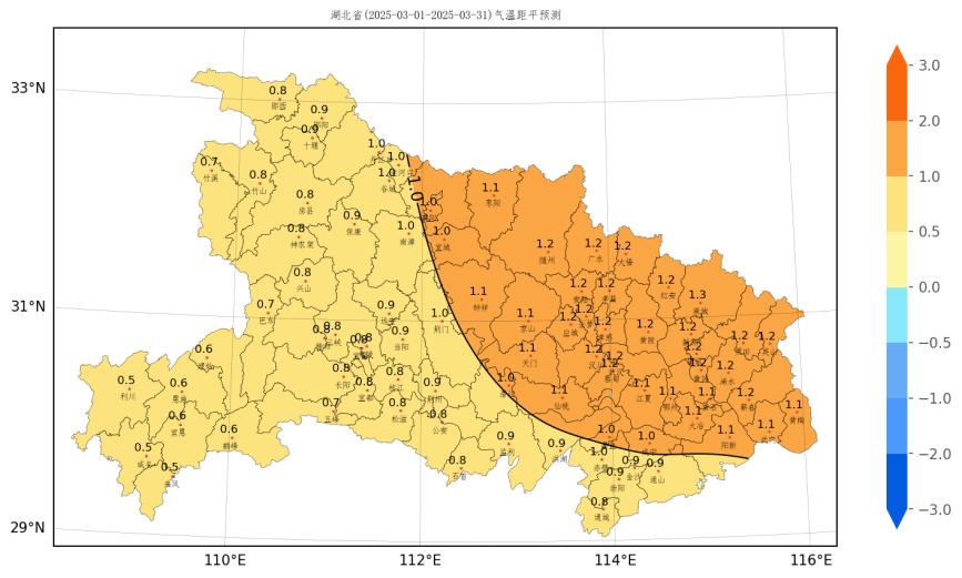 预计3月降水量鄂西50~70毫米,鄂东70~140毫米;与常年同期相比,鄂西北和鄂东北偏多1~3成,其他地区偏少1~2成。平均气温鄂西北、鄂西南南部9~12℃,其他大部12~13℃;与常年同期相比,气温大部偏高0.5~1.2℃。