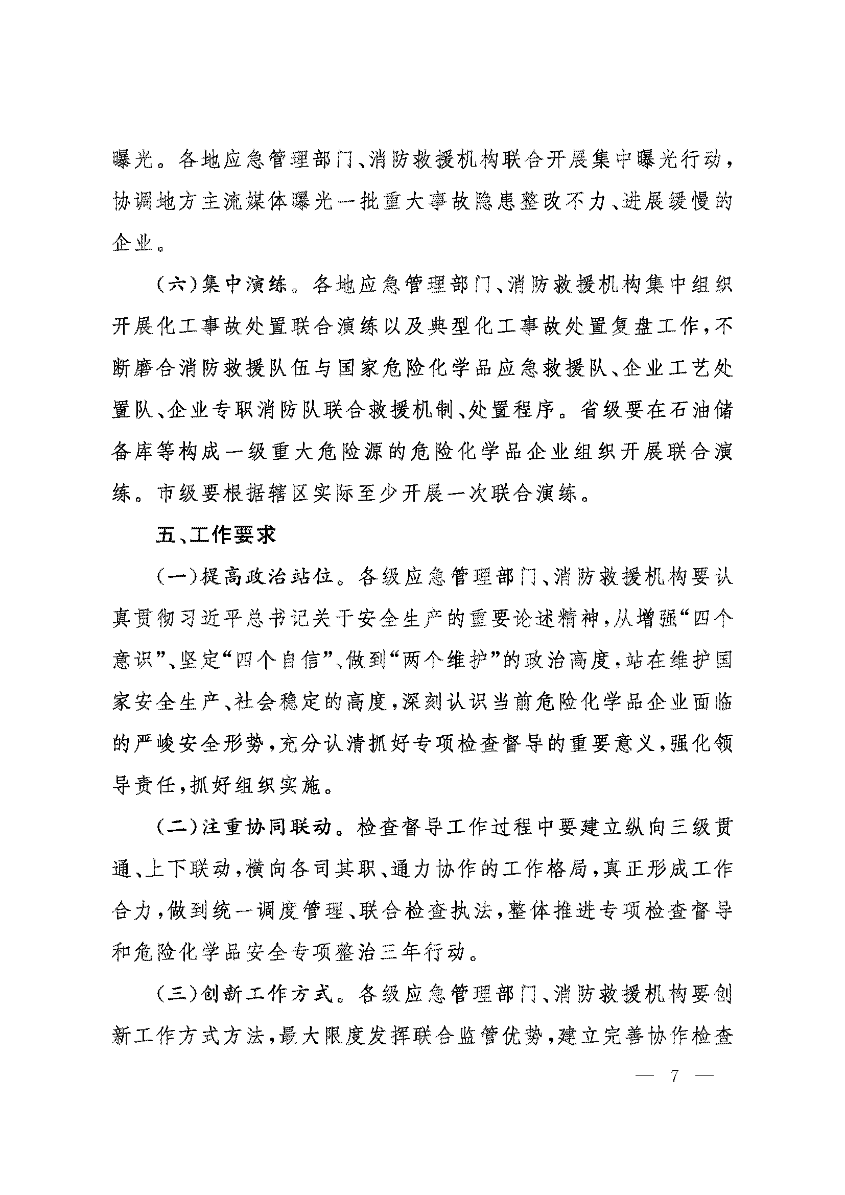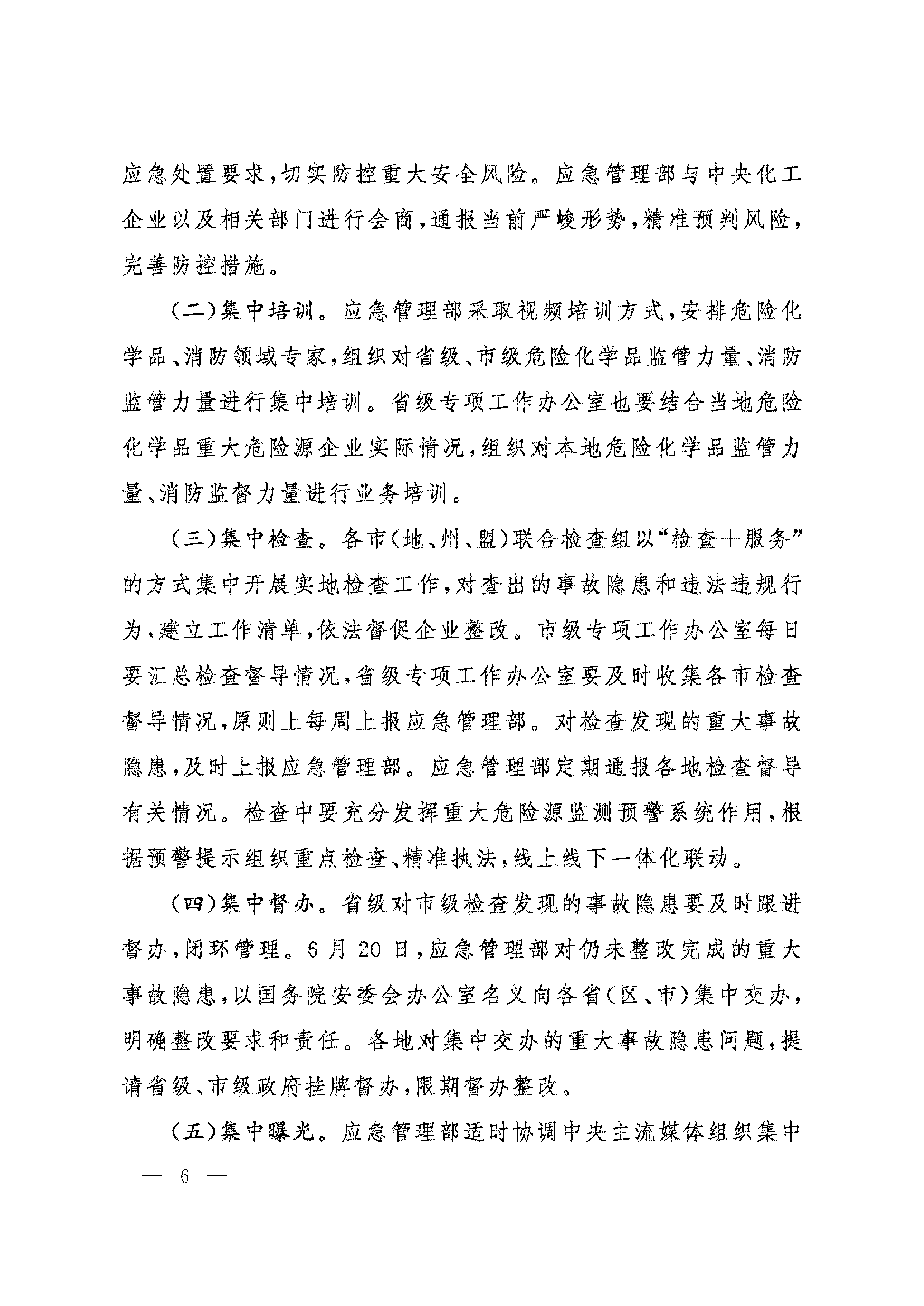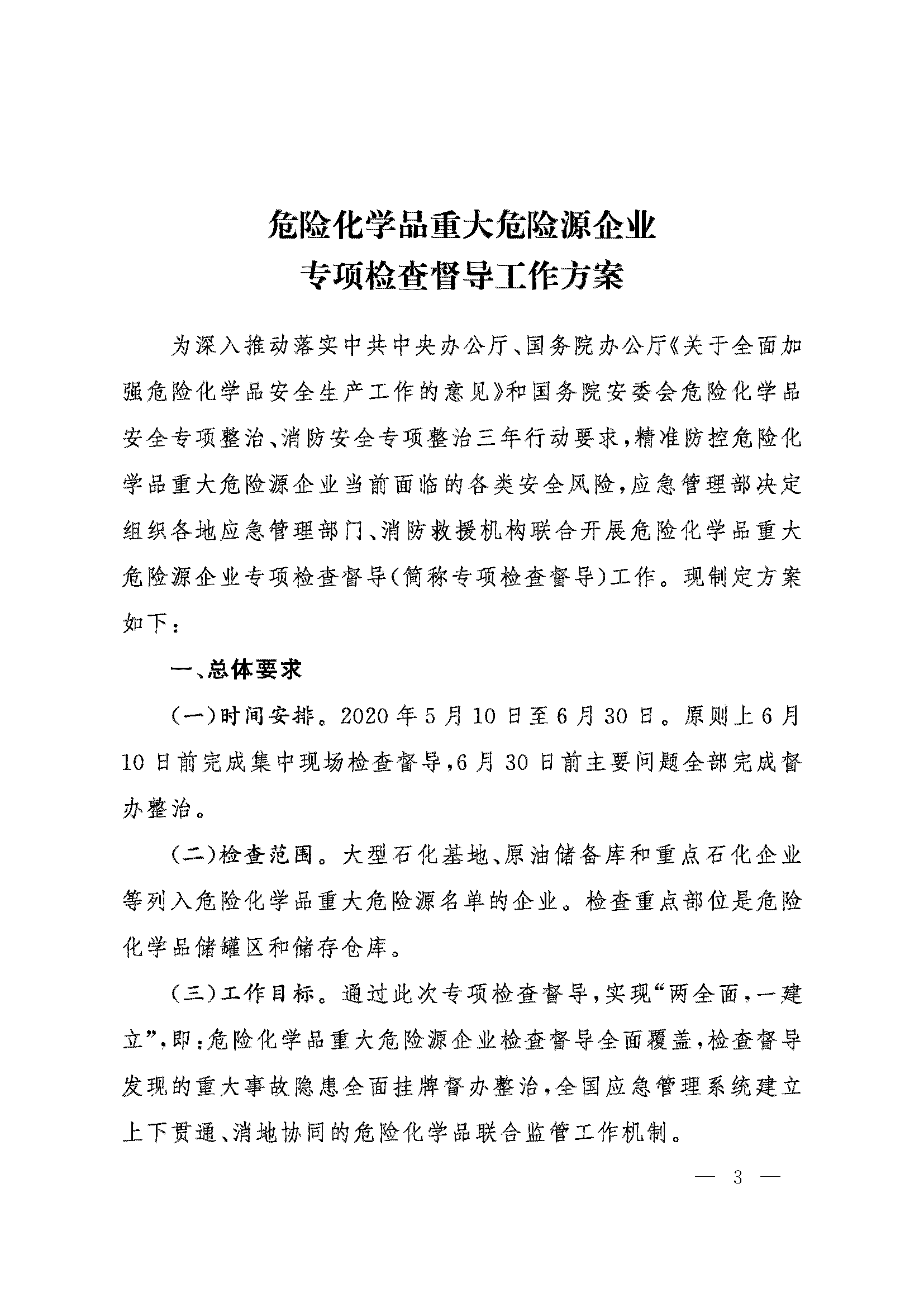深入贯彻落实中共中央办公厅 国务院办公厅《关于全面加强危险化学品安全生产工作的意见》和国务院安委会危险化学品安全专项整治、消防安全专项整治三年行动总体要求,深刻吸取江苏响水“3·21”特别重大爆炸等事故教训,坚决防范化解危险化学品重大安全风险,强化危险化学品重大危险源、烟花爆竹企业和风险程度较大企业生产及储存设施监管,突出治理安全责任不落实、安全投入不足、安全管理薄弱导致的安全条件不到位等突出问题,有效防范和遏制生产安全事故发生,为全国“两会”创造良好的安全稳定环境。