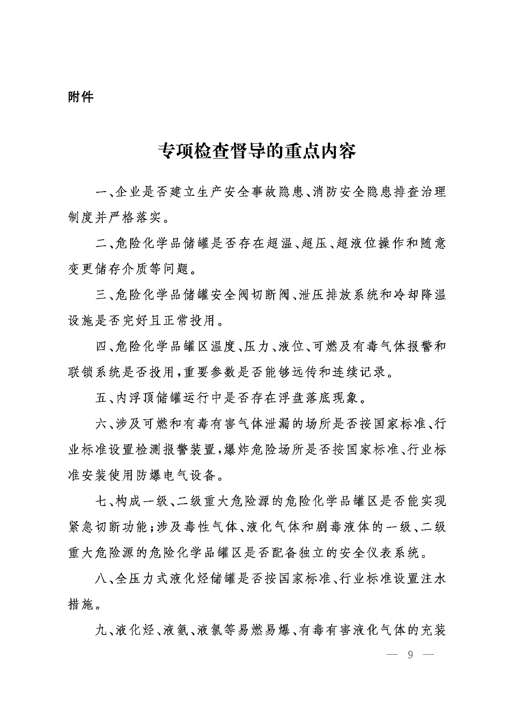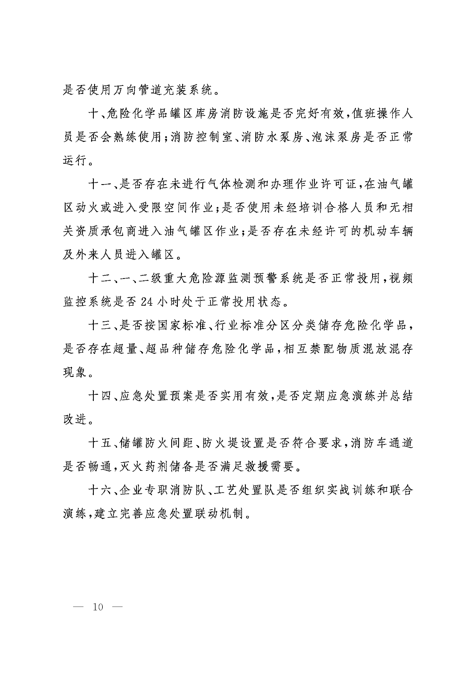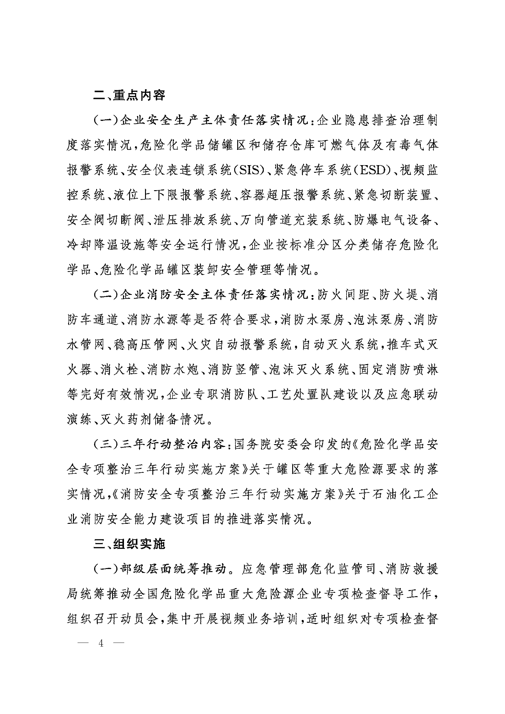 (一)企业安全生产主体责任落实情况:贯彻落实《危险化学品企业安全风险隐患排查治理导则》情况;危险化学品储罐区和储存仓库可燃气体及有毒气体报警系统、安全过程控制系统、安全仪表系统(SIS)、紧急停车系统(ESD)、视频监控系统、液位(温度、压力)上下(高高、低低)限报警系统、容器超压报警系统、紧急切断装置、安全阀、切断阀、泄压排放系统、万向管道充装系统、防爆电气设备、冷却降温设施等安全运行情况,企业按标准分区分类储存危险化学品、危险化学品罐区装卸安全管理等情况。检查烟花爆竹批发企业在线监测监控数据接入准备情况、“四知卡”“四防”落实情况及“六严禁”执行情况。