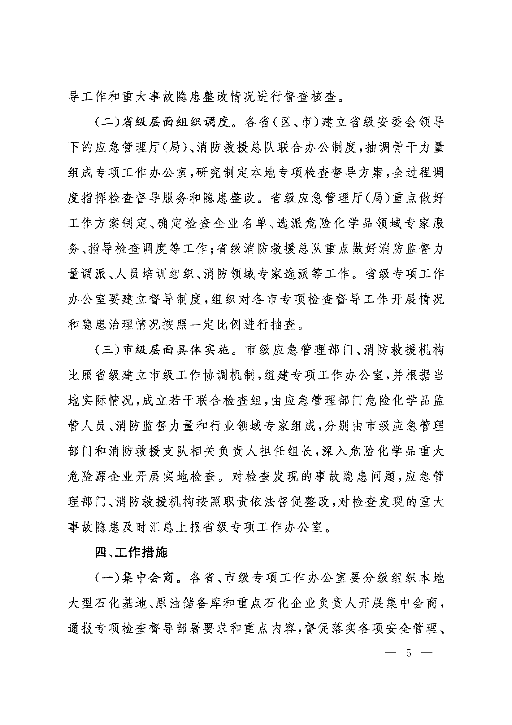 成立市专项检查督导工作领导小组,市应急管理局党组书记、局长袁用斌为组长,市应急管理局党组副书记、副局长张炎,市应急管理局党组成员、政治部主任徐丁山及市消防救援大队大队长胡尼飞为副组长,下设专项检查督导工作办公室,张炎、胡尼飞兼任办公室主任,成员由市应急局危险化学品安全监管科、市安全生产执法监察支队、市消防救援大队相关人员组成。办公室分别设在危险化学品安全监管科、市消防救援大队,负责制定市级专项检查督导方案,全过程调度指挥检查督导服务和隐患整改,负责建立督导制度,组织对各地专项检查督导工作开展情况和隐患治理情况按照一定比例进行抽查。市应急管理局确定检查督导企业名单,选派危险化学品领域专家,服务、指导、检查、调度等工作,市综合消防救援大队重点做好消防监督力量调派、人员培训组织、消防领域专家选派等工作。