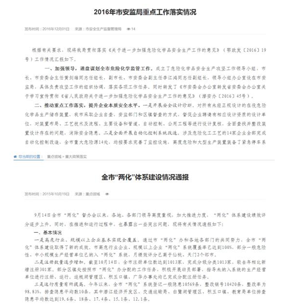 2016年我局围绕市安监局重点工作,加强全市危险化学品工作,落实省政府关于加强危险化学品安全生产工作的意见,通过加强领导,加强监管执法,严格行政许可,强化宣传教育等措施,确保安全生产工作顺利稳步进行。同时落实“两化”督办工作,促使“两化”体系建设绩效评分逐步上升,取得可喜成绩。