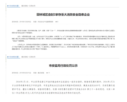 为规范安全生产行政处罚案件信息主动公开工作,促进公正文明执法,维护市场秩序,保障公民、法人和其他组织的合法权益,2016年共公开行政处罚信息2起。
