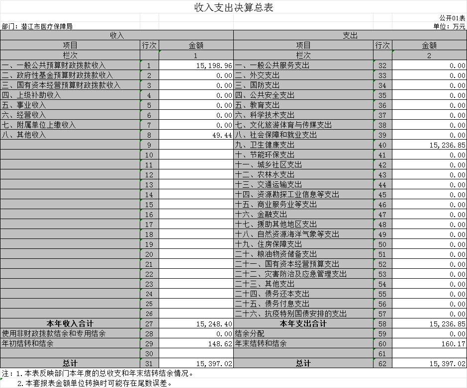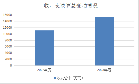 2023年度收、支总计均为15397.02万元。与2022年度相比,收、支总计各增加4234.24万元,增长37.93 %,主要原因是项目中居民医保基金市级财政补助项目每年增加配套补助标准。
