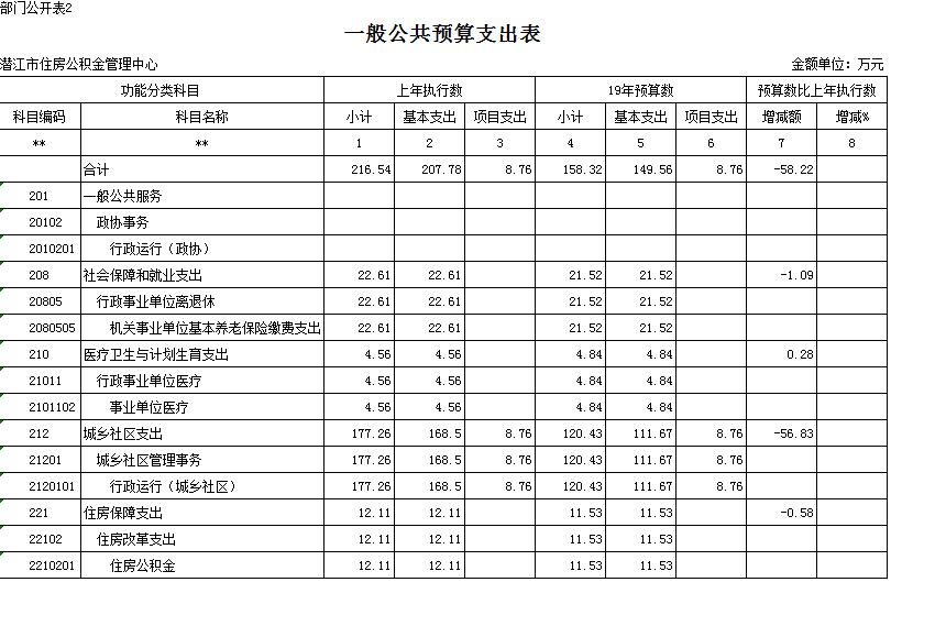 4、住房保障2019年预算数11.53万元,比上年执行数减少0.58万元,下降4.78%,主要是住房公积金减少。
