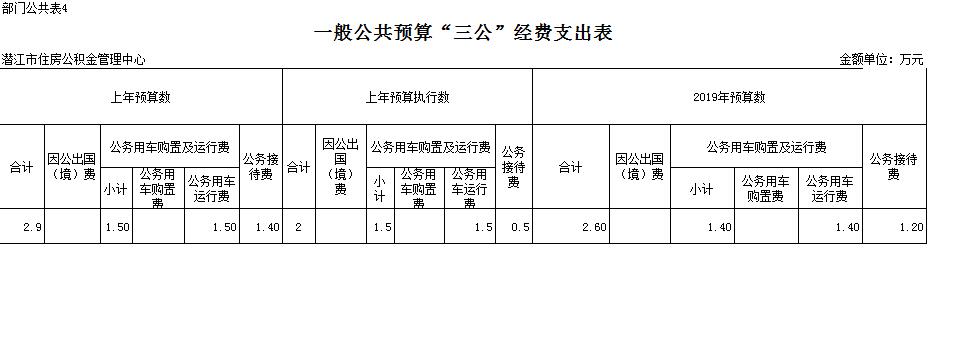 本部门2019年“三公”经费预算数为5.6万元,其中:因公出国(境)经费0万元,公务接待费2.5万元,公务用车购置及运行费3.1万元。2019年“三公”经费预算比上年“三公”预算减少0.9万元,比上年执行数增加了1.6万元。