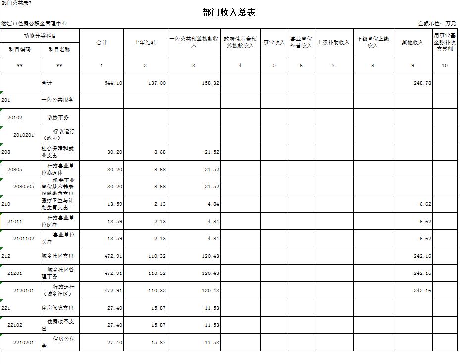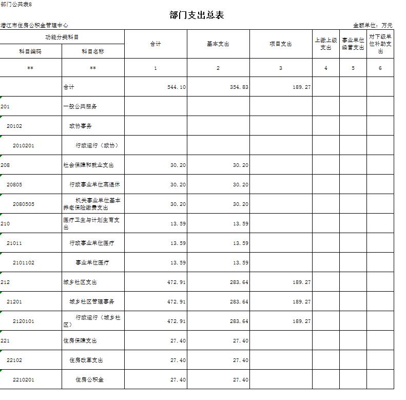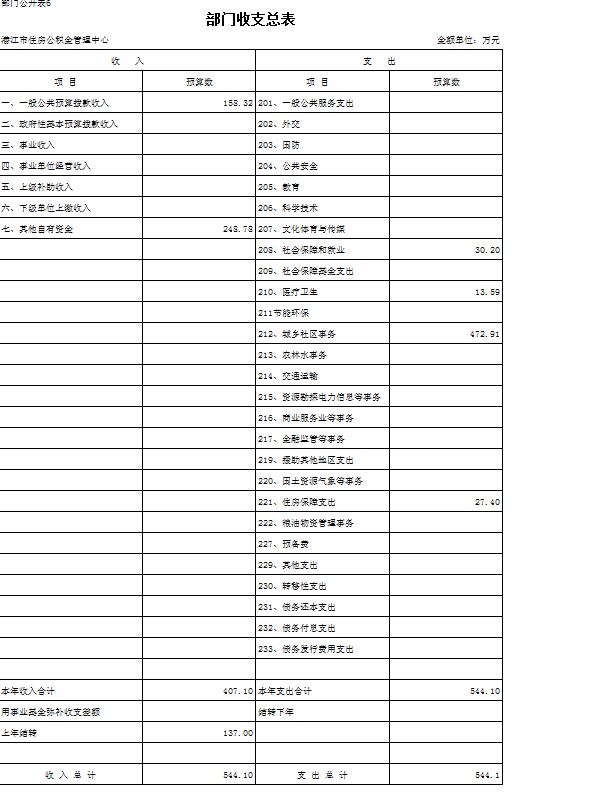 按照综合预算的原则,本部门所有收入和支出均纳入部门预算管理。2019年, 收入预算为544.1万元,其中:财政预内安排158.32万元,其他收入385.78万元。(公积金增值收益转拨上年结余资金137万元。增值收益转拨248.78万元)。相应安排支出预算544.1万元,按经济分类包括:工资福利支出300.23万元,对个人和家庭补助支出6万元,公用支出48.6万元,项目支出189.27万元。按功能支出分类包括:社会保障和就业30.2万元,医疗卫生13.59万元,城乡社区事务472.91万元,住房保障支出27.4万元。本部门收支总预算544.1万元。