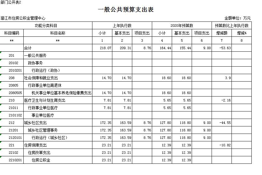 4、住房保障2020年预算数12.39万元,比上年执行数减少10.8万元,下降46.53%,主要是住房公积金减少。