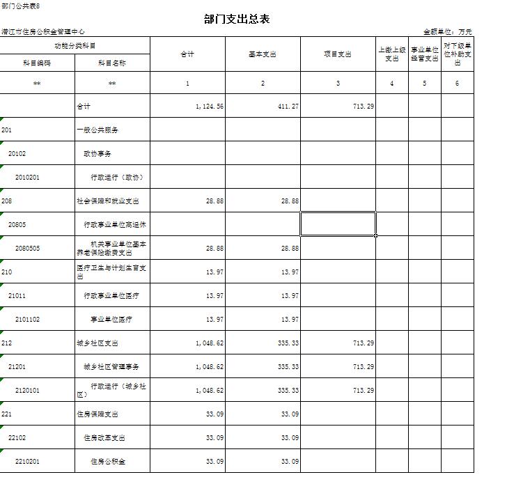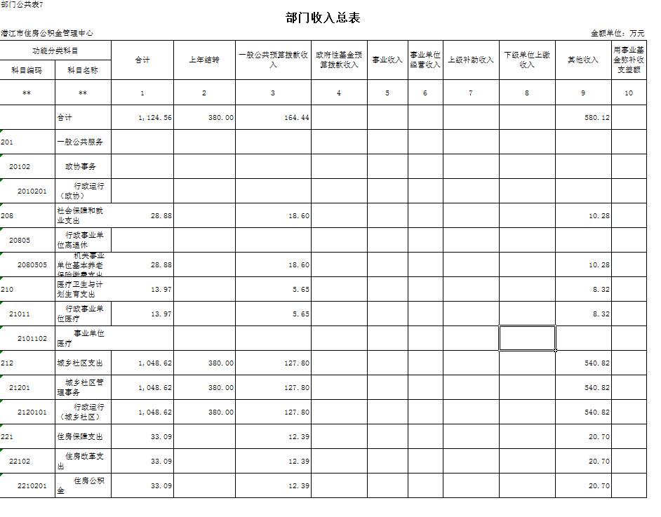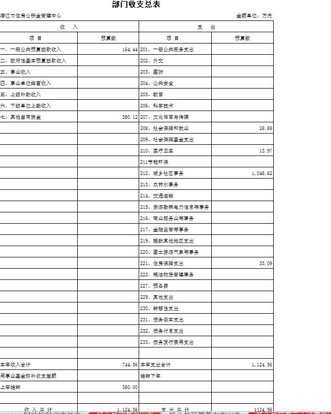 按照综合预算的原则,本部门所有收入和支出均纳入部门预算管理。2020年, 收入预算为1124.56万元,其中:财政预内安排164.44万元,其他收入960.12万元。(公积金增值收益转拨上年结余资金380万元。增值收益转拨580.12万元)。相应安排支出预算1124.56万元,按经济分类包括:工资福利支出355.67万元,对个人和家庭补助支出6.6万元,公用支出49万元,项目支出713.29万元。按功能支出分类包括:社会保障和就业28.88万元,医疗卫生13.97万元,城乡社区事务1048.62万元,住房保障支出33.09万元。本部门收支总预算1124.56万元。