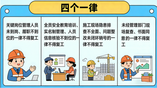 各相关单位要立即进入工作状态,全面启动节后复工复产督导检查工作,对我市在建房屋市政工程开展拉网式摸排,精准分类建立停工项目、复工准备项目、已复工项目三本台账,实现项目底数清、管控状态明、责任落实到人。要严格执行复工复产验收标准和程序,压紧压实企业主体责任、项目首要责任,刚性落实四个一律复工条件:关键岗位管理人员未到岗、履职不到位的一律不得复工;全员安全教育培训、实名制管理、人员信息核验不到位的一律不得复工;施工现场隐患排查不全面、问题整改未闭环销号的一律不得复工;未经管理部门现场复查、书面同意的一律不得复工。对未经审批擅自复工、隐患整改敷衍了事、验收搞变通走过场的项目,依法从严从重查处,坚决杜绝未验先干、带病复工,确保复工复产条件审核严丝合缝、落地见效。