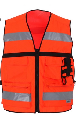 1、统一采用防静电橘黄色背心,白色国标宋体字体,贴反光条;