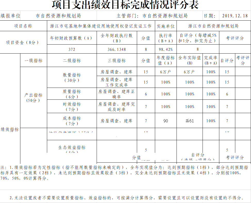 潜江市宅基地和集体建设用地使用权确权登记发证工作项目绩效自评综述:主要产出和效益:一是数量指标。2019年计划完成房屋调查、建库6万户,实际完成6万户,工作完成率100%。二是时效指标。2019年确权登记工作完成及时率100%。三是质量指标。2019年确权合格率100%。四是成本指标。2019年房屋调查、建库计划户均成本≦90元。实际户均成本≦61元。五是效益指标。社会效益指标,建立健全不动产登记制度,提高政府行政效能和监管水平,保护用地户和房屋所有者的合法权益,指标值良好。六是满意度指标。服务对象满意度100%。