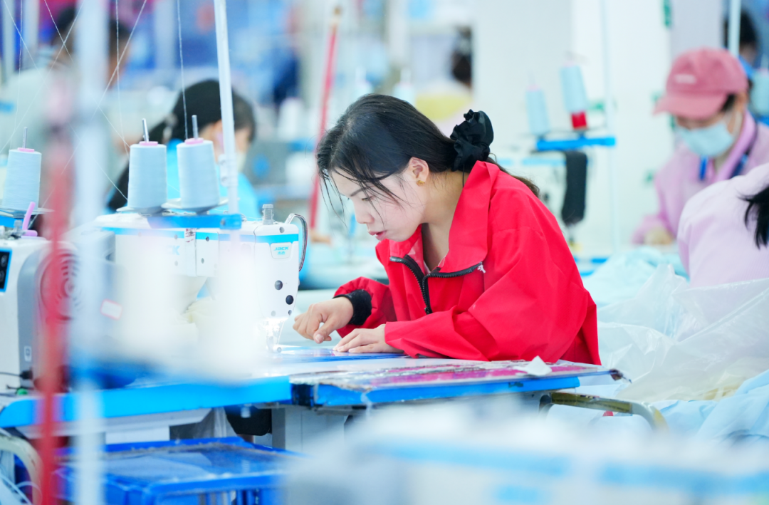 潜江市多美制衣有限公司的车间里,同样一派繁忙。裁剪、缝纫、熨烫……工人们分工协作,一件件羽绒服在流水线上快速成型。