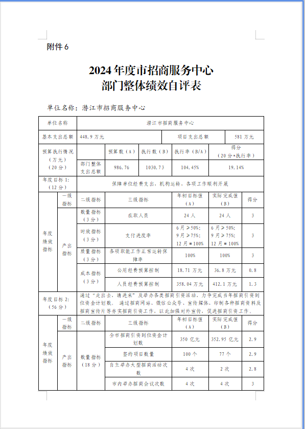 一、2024年度潜江市招商服务中心本级整体绩效评价自评表