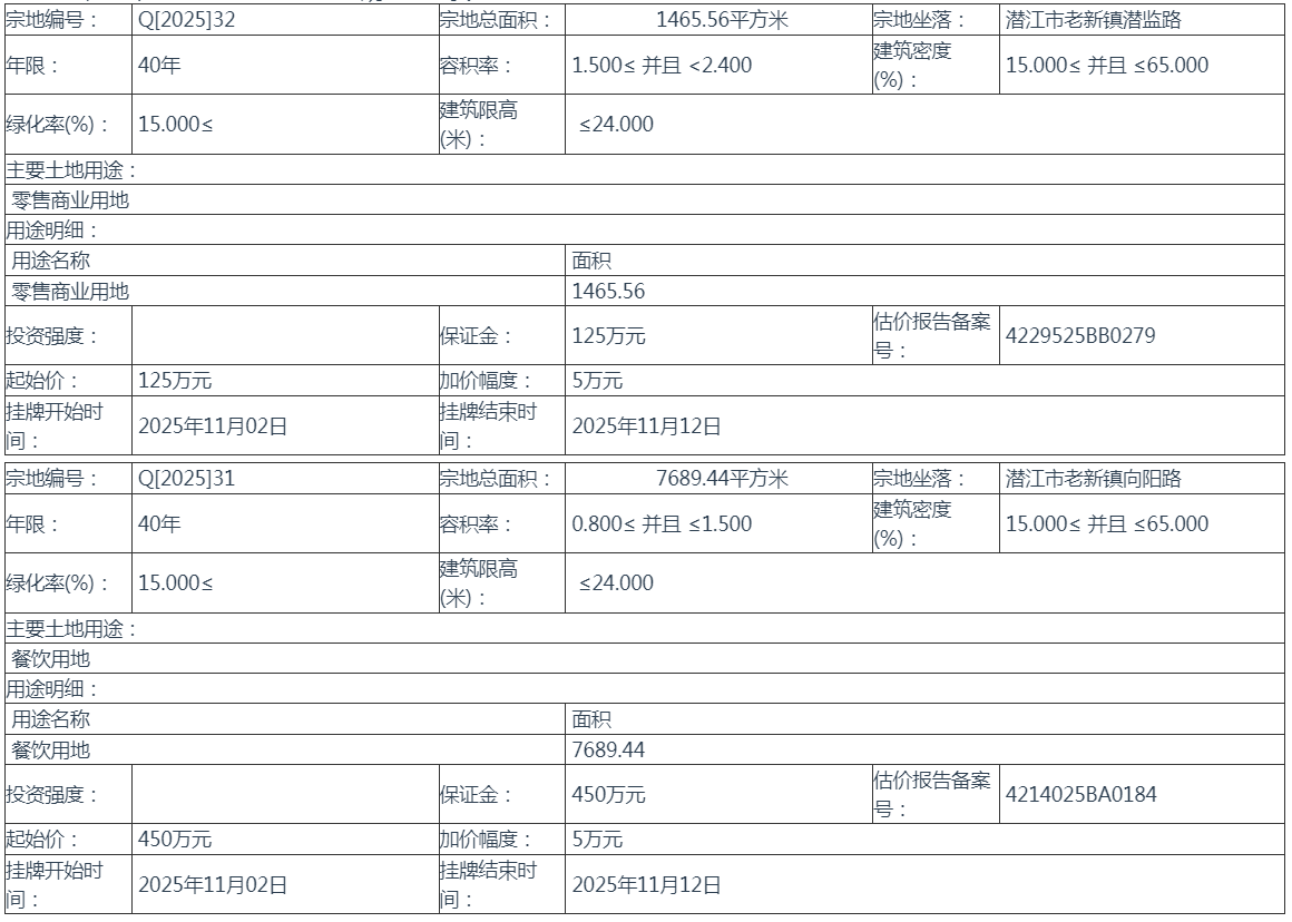 潜江市国有土地使用权挂牌出让公告(潜土交告字[2025]31-32号)
