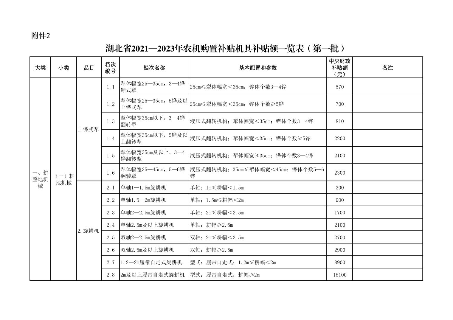 二、补贴标准。农机购置补贴实行定额补贴。补贴范围内各机具品目的主要分档参数依据省农业农村厅、省财政厅发布的主要分档参数制定。具体补贴标准按照《湖北省2021—2023年农机购置补贴机具补贴额一览表》执行。