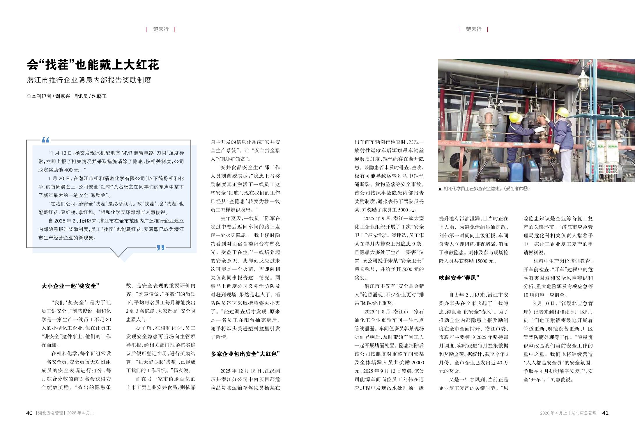 会“找茬”也能戴上大红花 潜江市推行企业隐患内部报告奖励制度