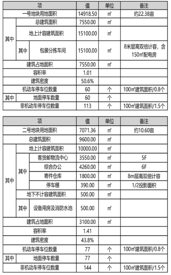 总用地面积为21989.86㎡(其中一号地块净用地面积14918.50㎡,二号地块净用地面积7071.36㎡) 。一号地块容积率1.01,建筑密度50.6%;二号地块容积率1.41,建筑密度43.8%。
