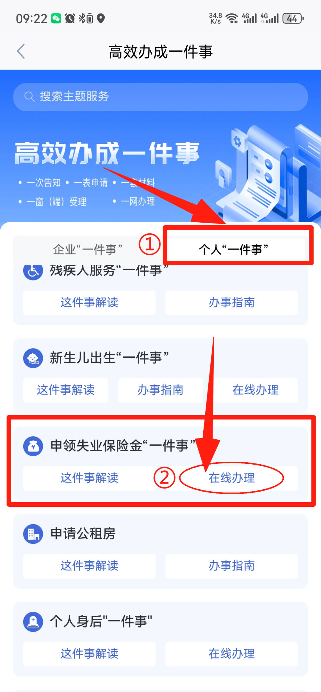 3. 点击【个人"一件事"】并向下滑,找到【申领失业保险金"一件事"】点击【在线办理】
