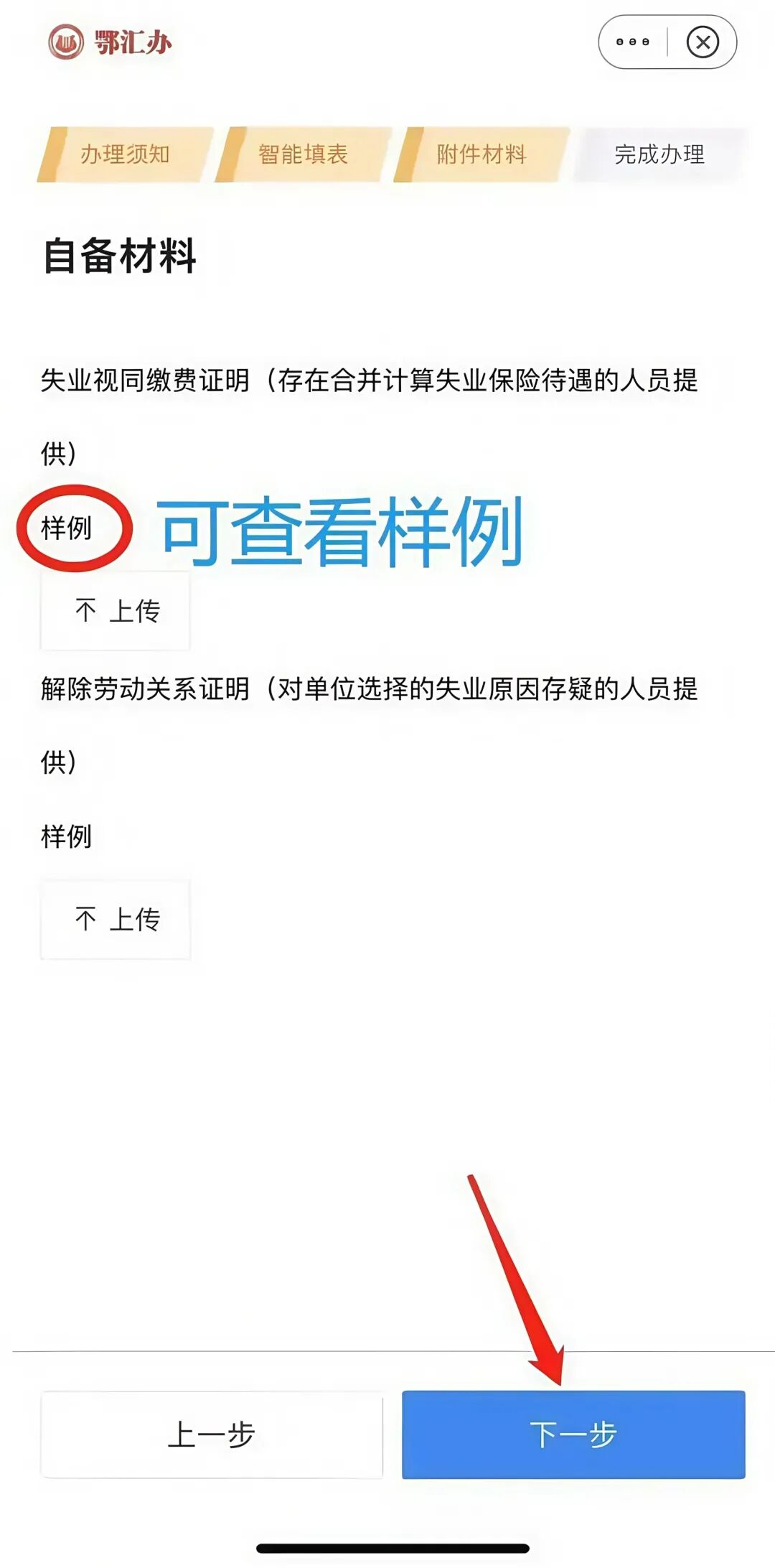 8. 根据自身情况选择上传附件,不需要上传可直接点【下一步】,即办理完成。