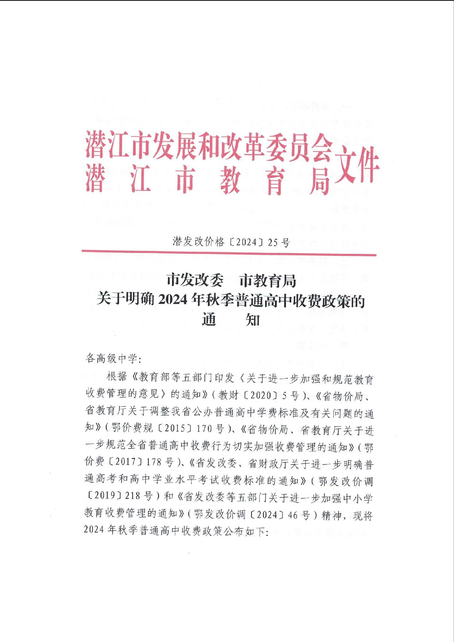 名 称: 关于明确2024年秋季普通高中收费政策的通知