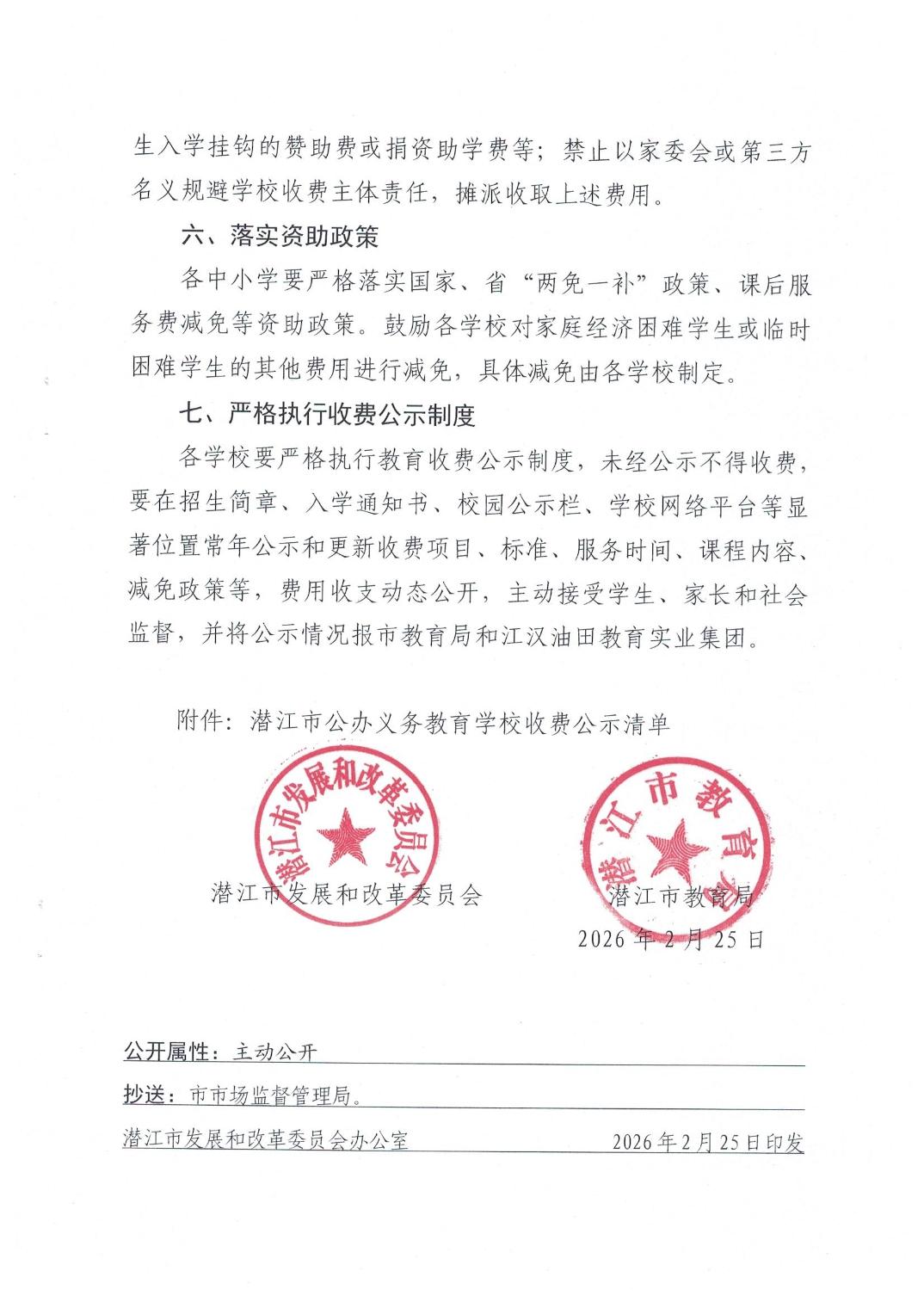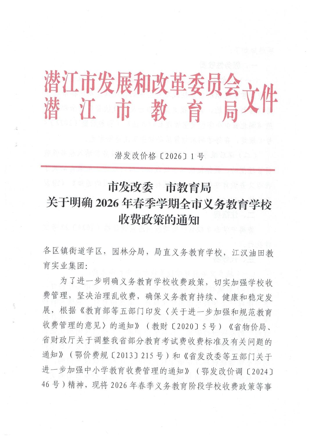 关于明确2026年春季学期全市义务教育学校收费政策的通知