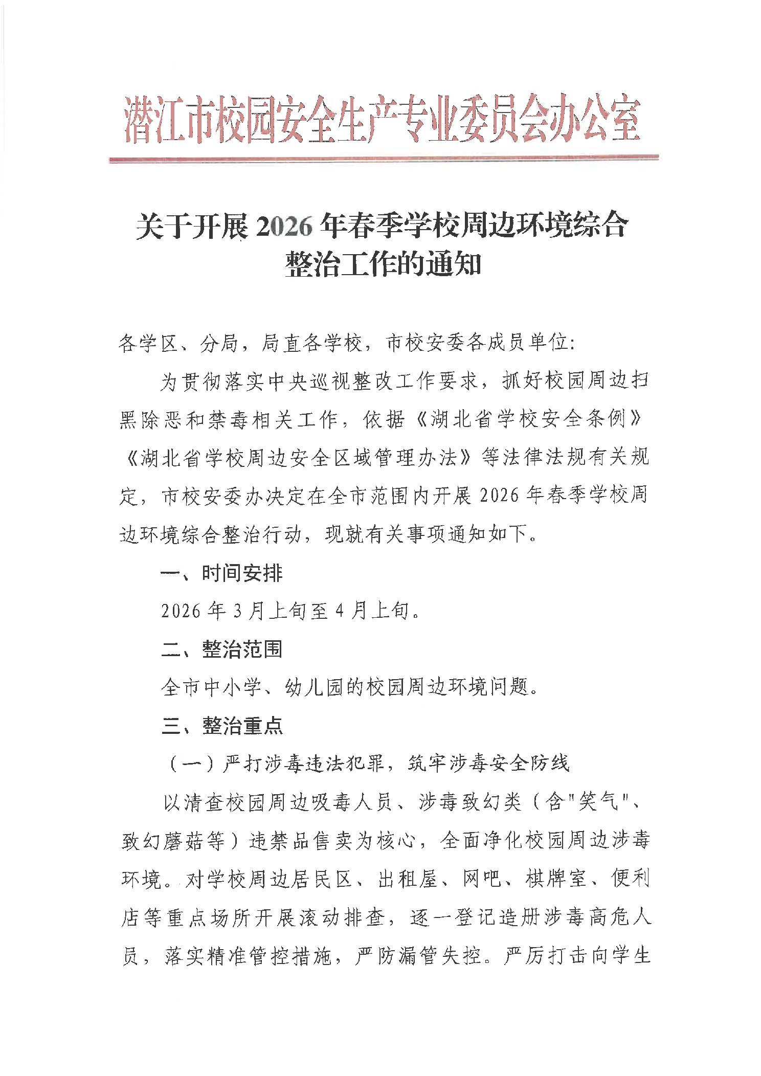 潜江市校园安全生产专业委员会办公室关于开展2026年春季学校周边环境综合整治工作的通知