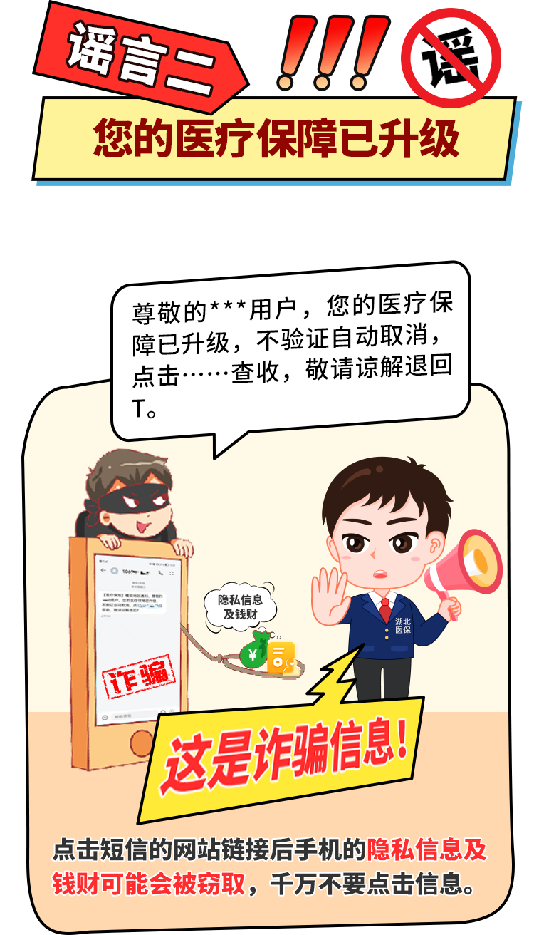 医保相关政策均通过官方网站、官方微信公众号等正规渠道进行公告,不会发送含网址链接的短信。如遇医保个人账户信息出现异常,请电话咨询当地医保部门或前往医保服务大厅进行咨询、办理。