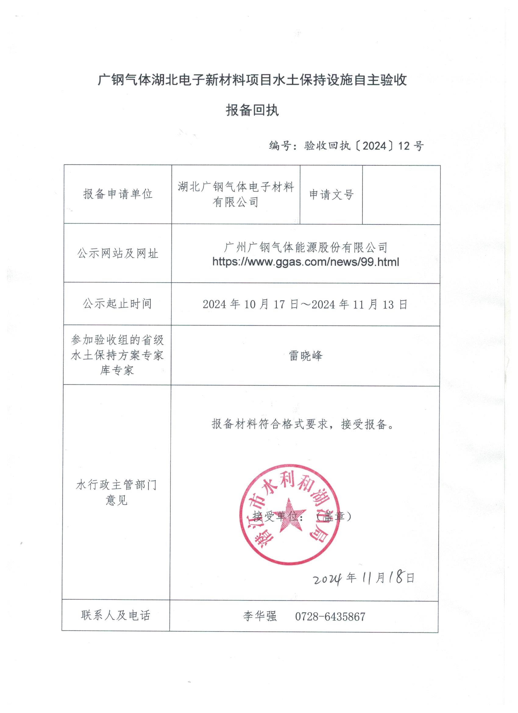 名 称: 广钢气体湖北电子新材料项目水土保持设施自主验收报备回执