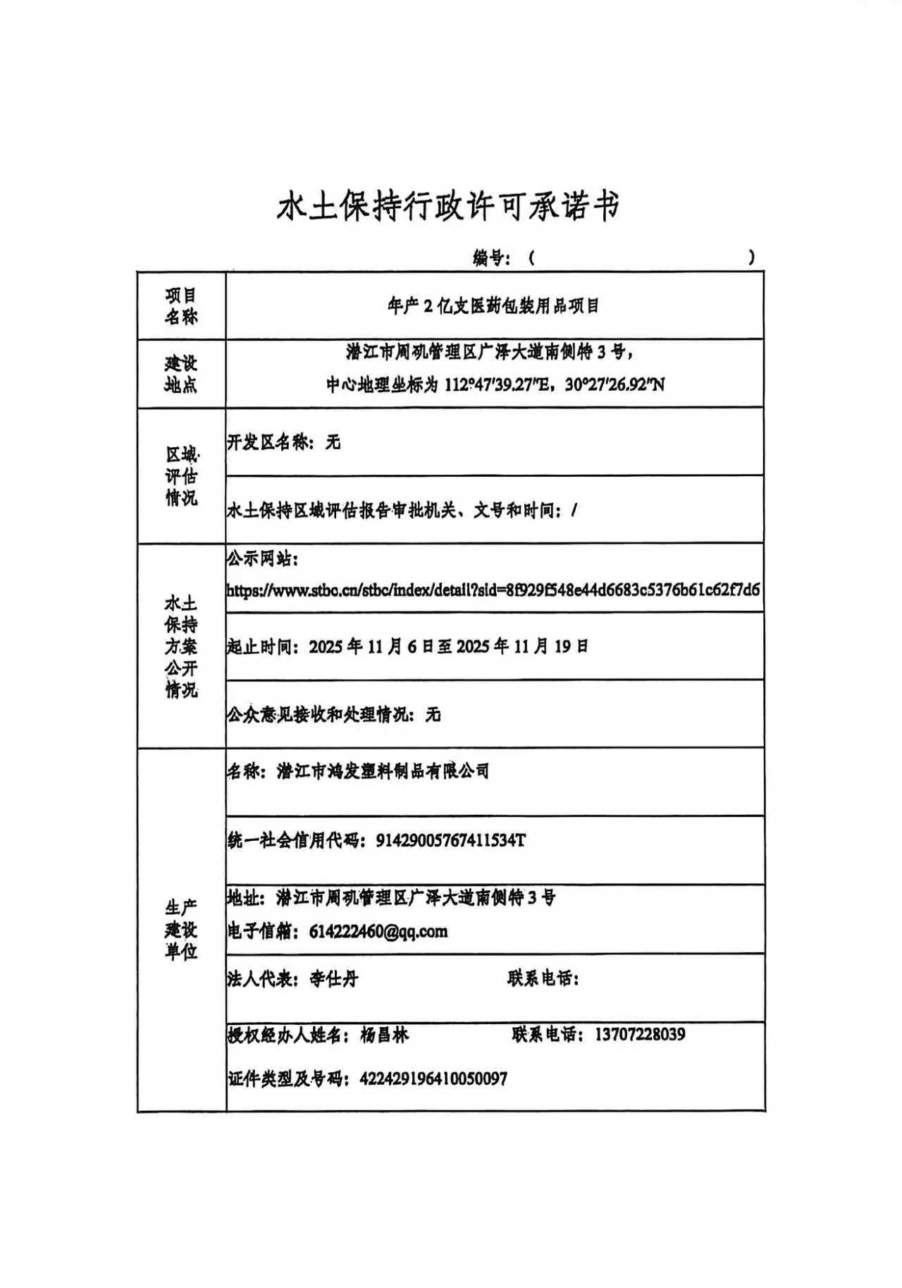 潜江市鸿发塑料制品有限公司年产2亿支医药包装用品项目水土保持方案许可