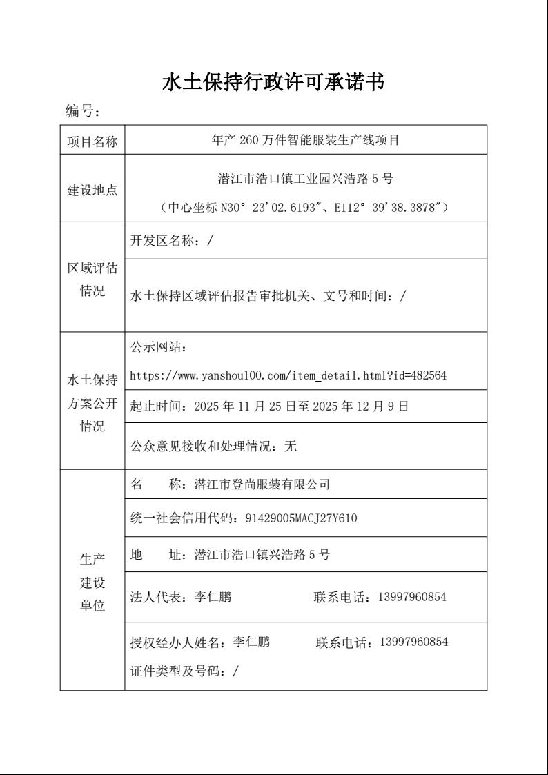 潜江市登尚服装有限公司年产260万件智能服装生产线项目水土保持方案许可