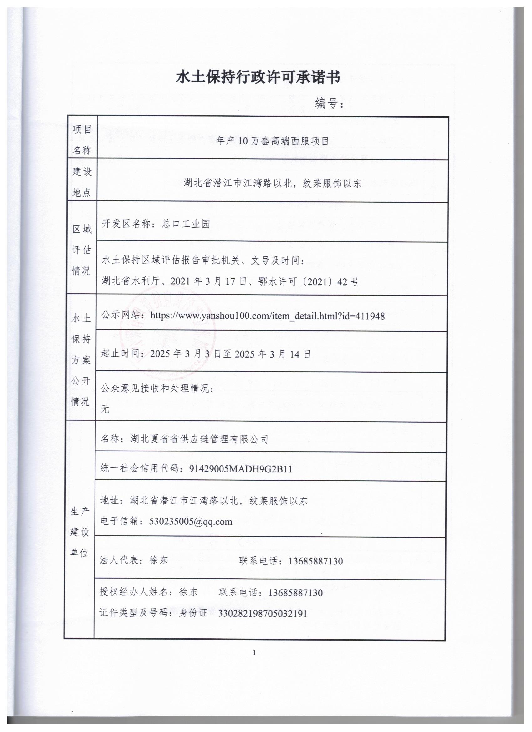 名 称: 湖北夏省省供应链管理有限公司年产 10万套高端西服项目