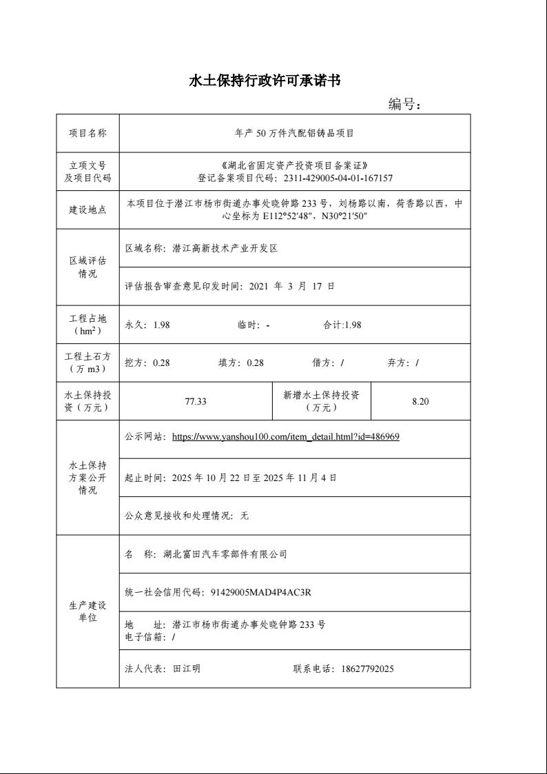 潜江高新技术产业开发区年产50万件汽配铝铸品项目水土保持方案许可