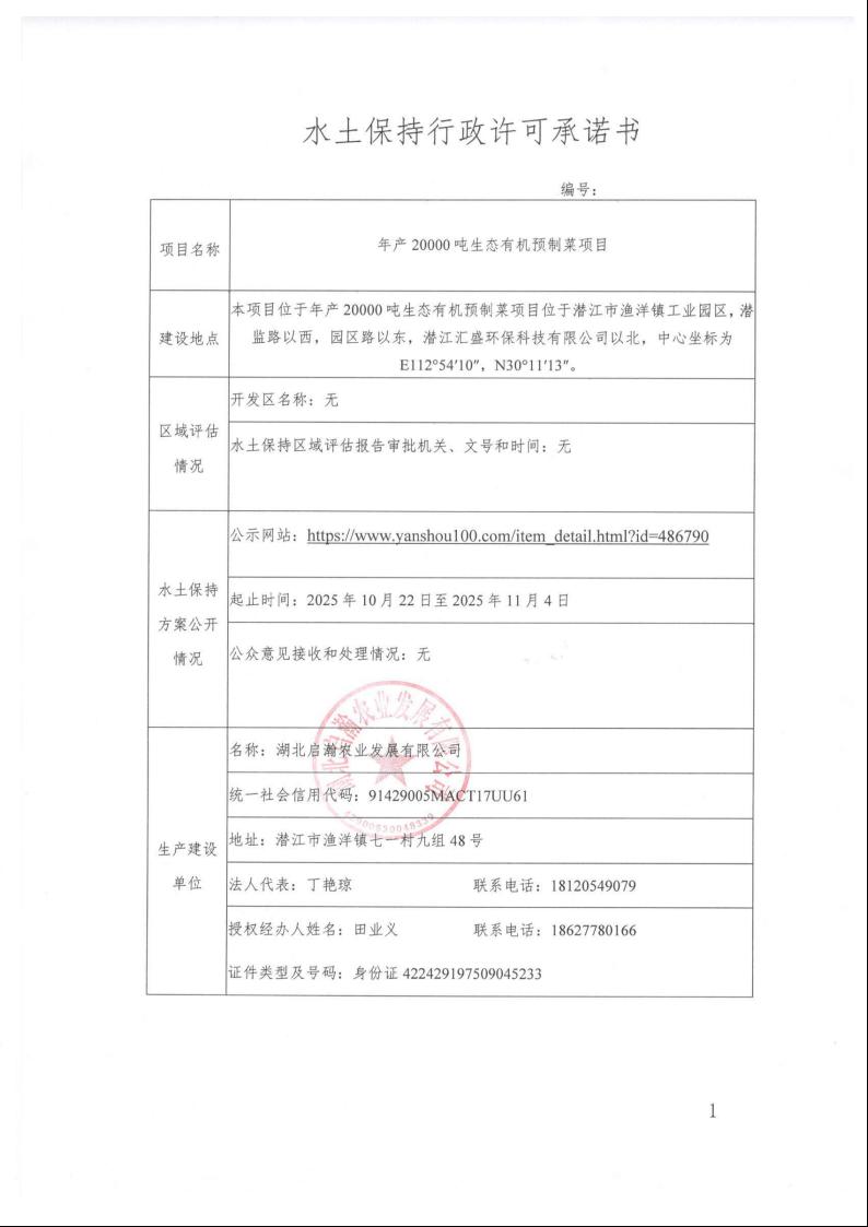 湖北启瀚农业发展有限公司年产20000吨生态有机预制菜项目水土保持方案许可