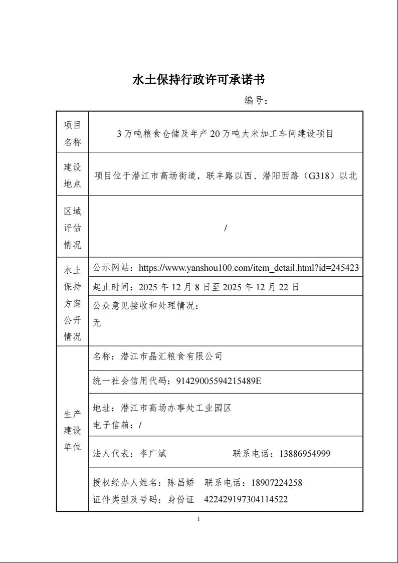 潜江市晶汇粮食有限公司3万吨粮食仓储及年产20万吨大米加工车间建设项目水土保持方案许可
