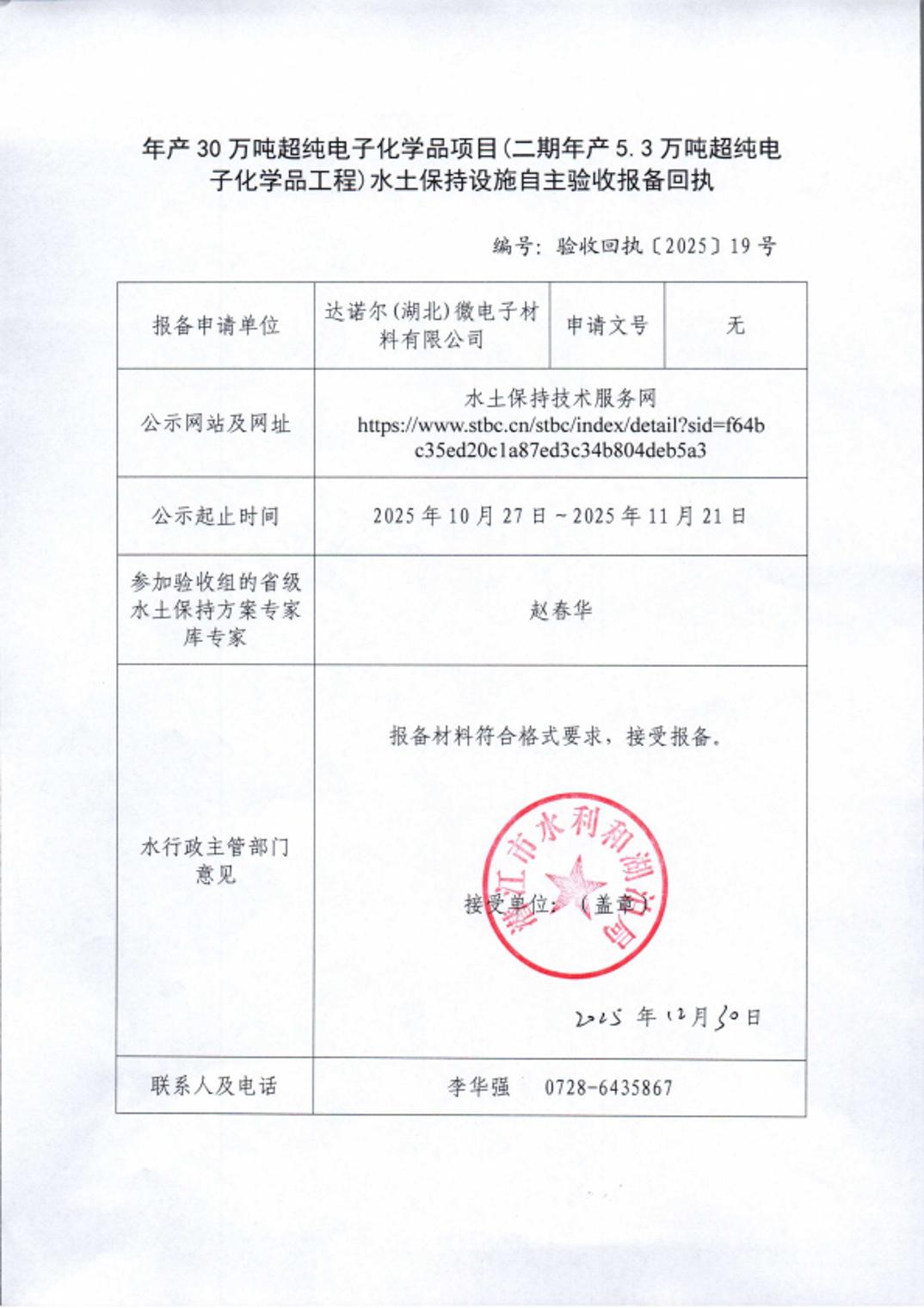 年产30万吨超纯电子化学品项目(二期年产5.3万吨超纯电子化学品工程)水土保持设施自主验收报备回执