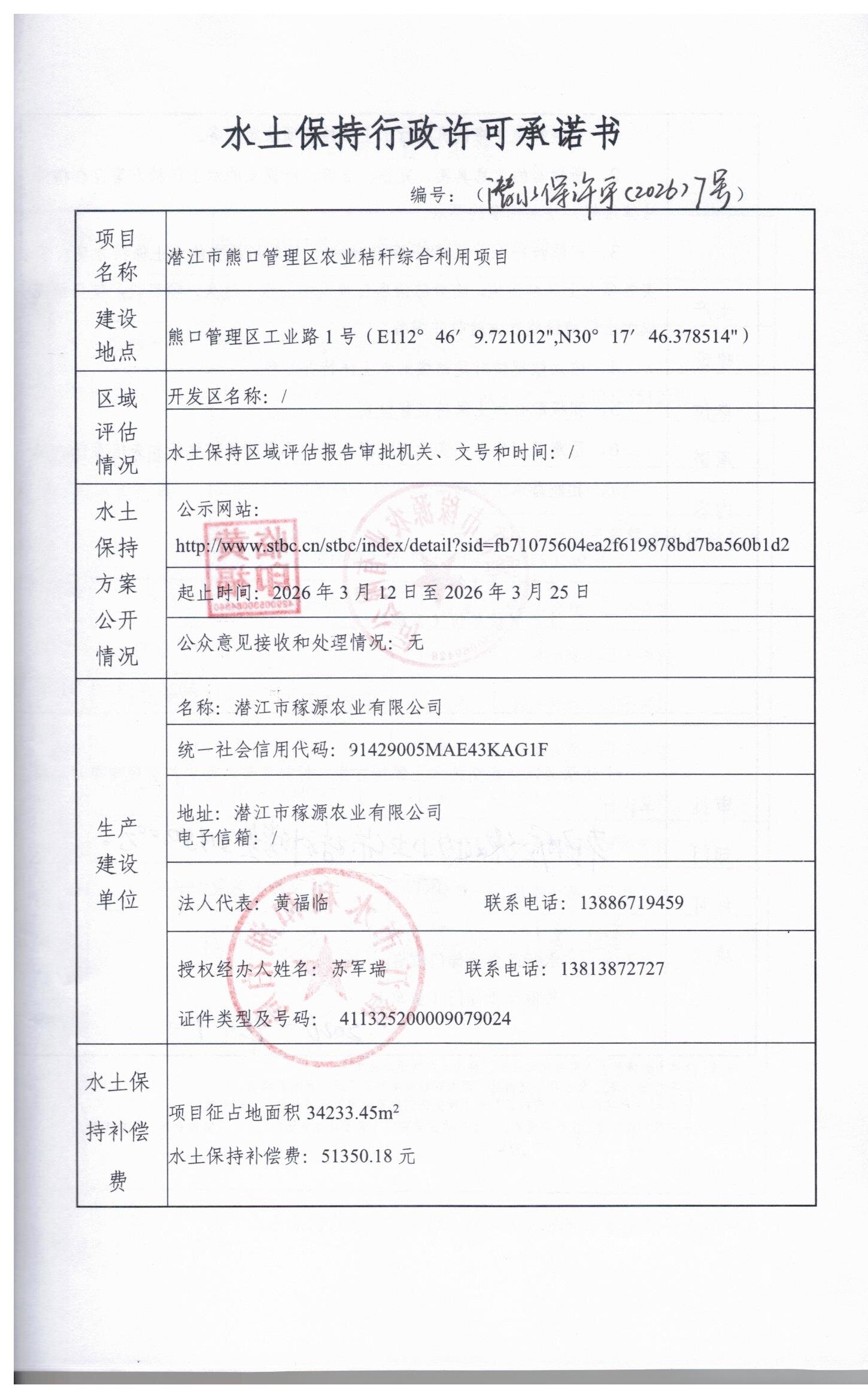 名 称: 潜江市熊口管理区农业秸秆综合利用项目水土保持方案许可