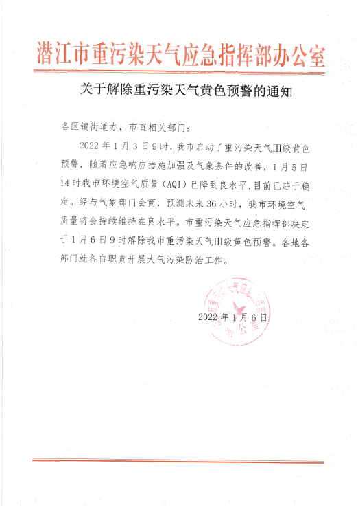 名 称: 关于解除重污染天气黄色预警的通知