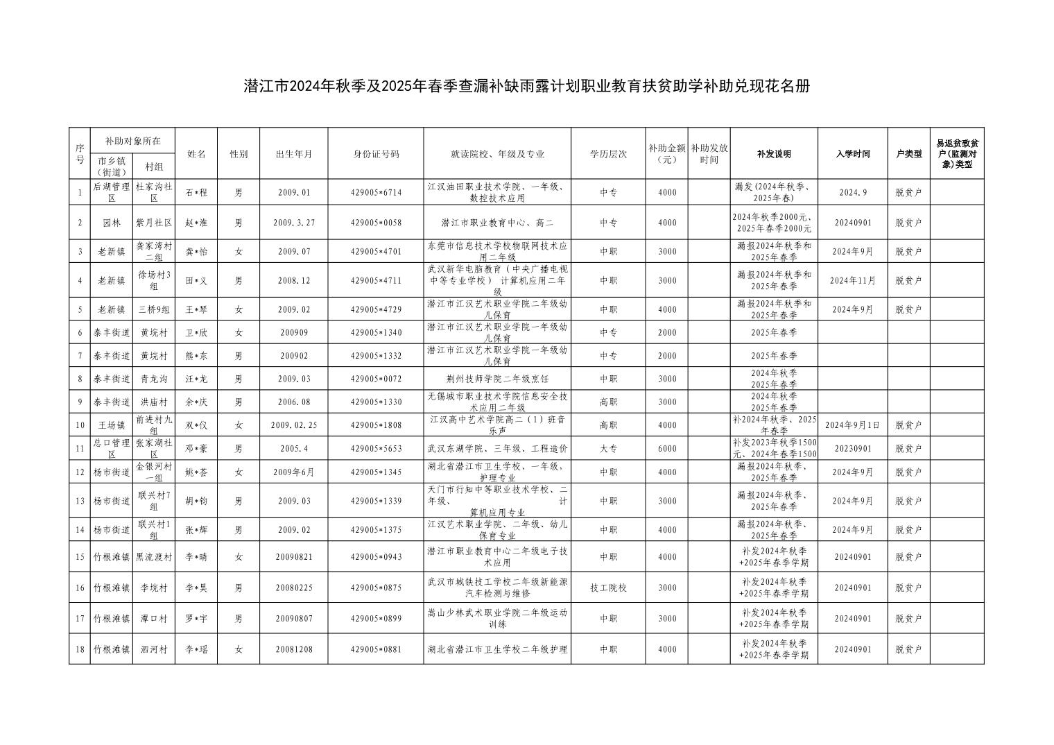 潜江市2024年秋季及2025年春季查漏补缺雨露计划职业教育扶贫助学补助兑现花名册