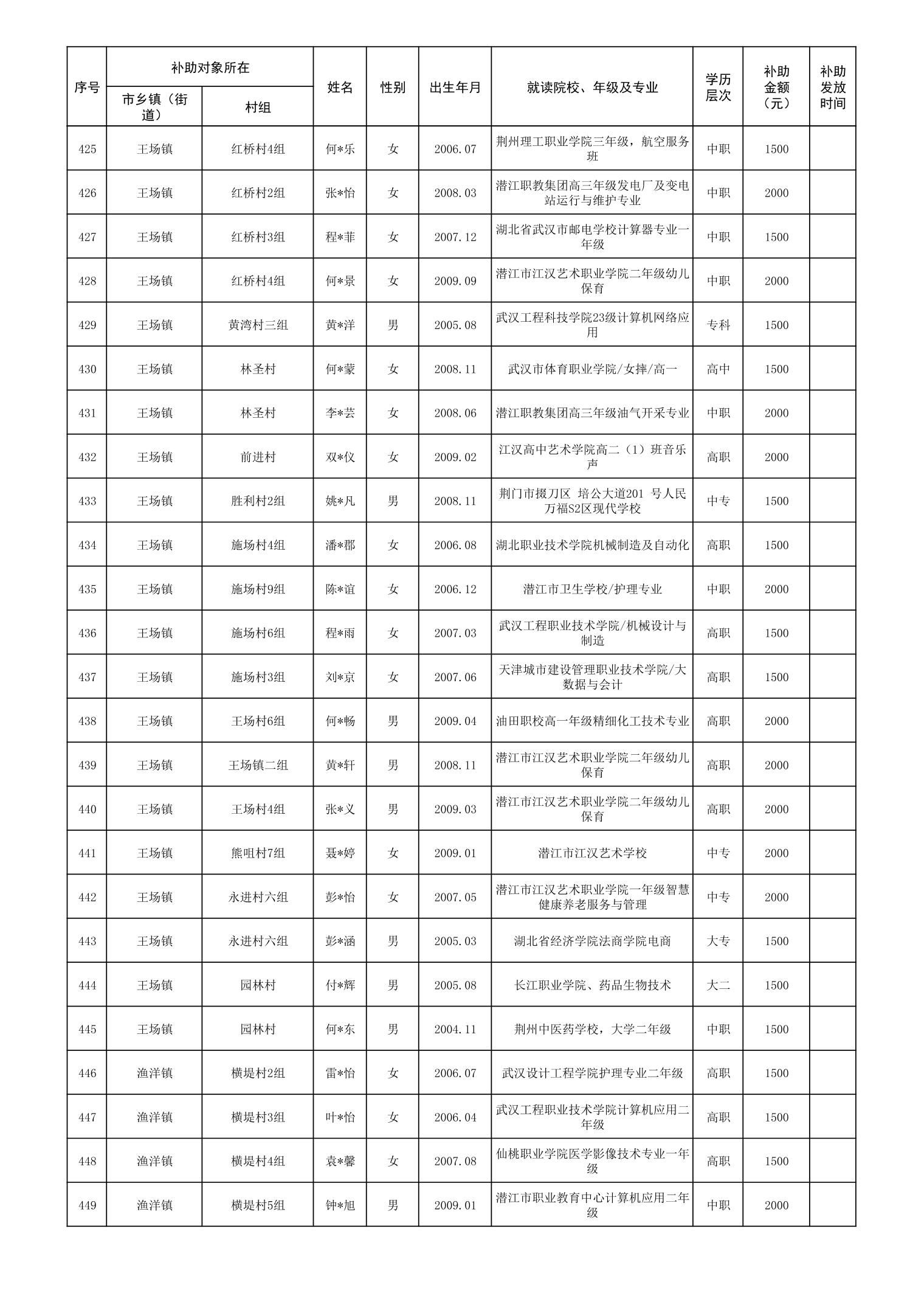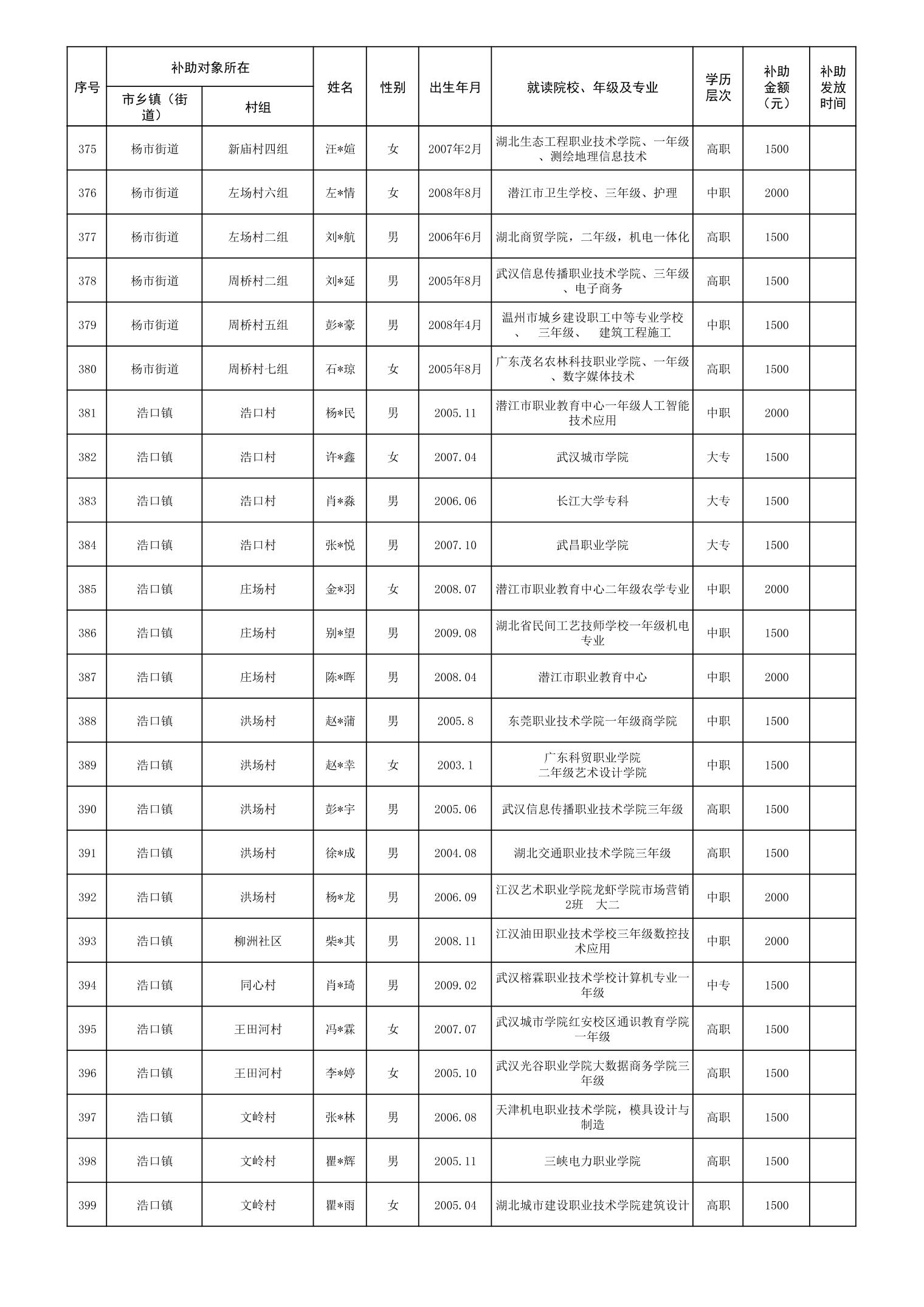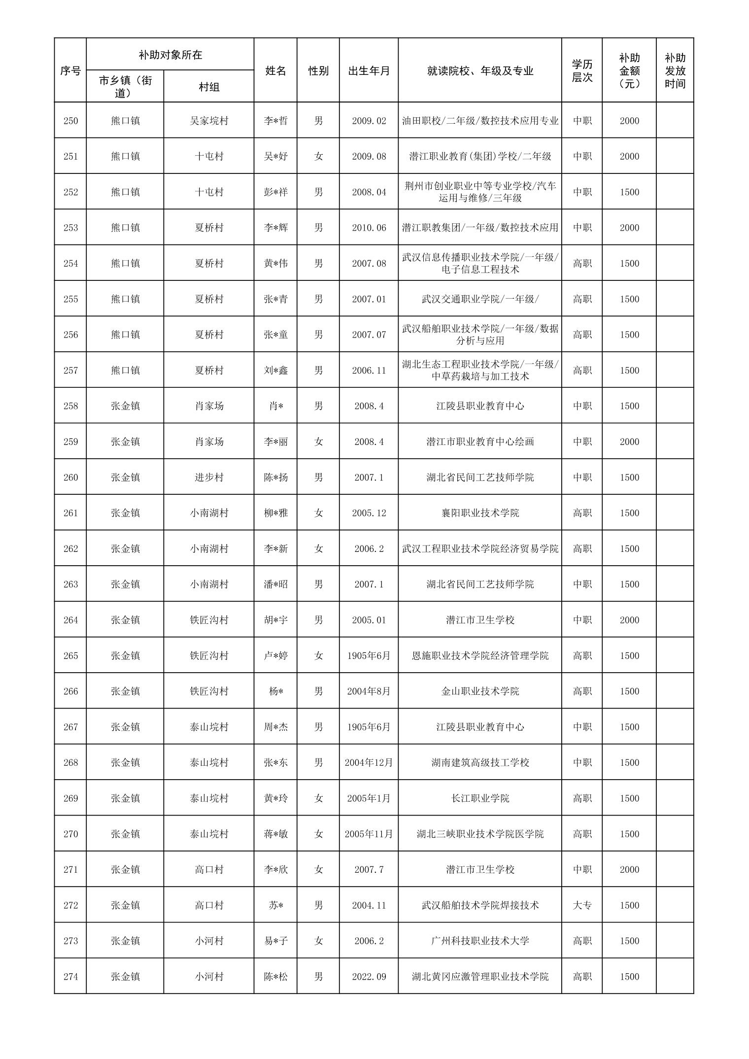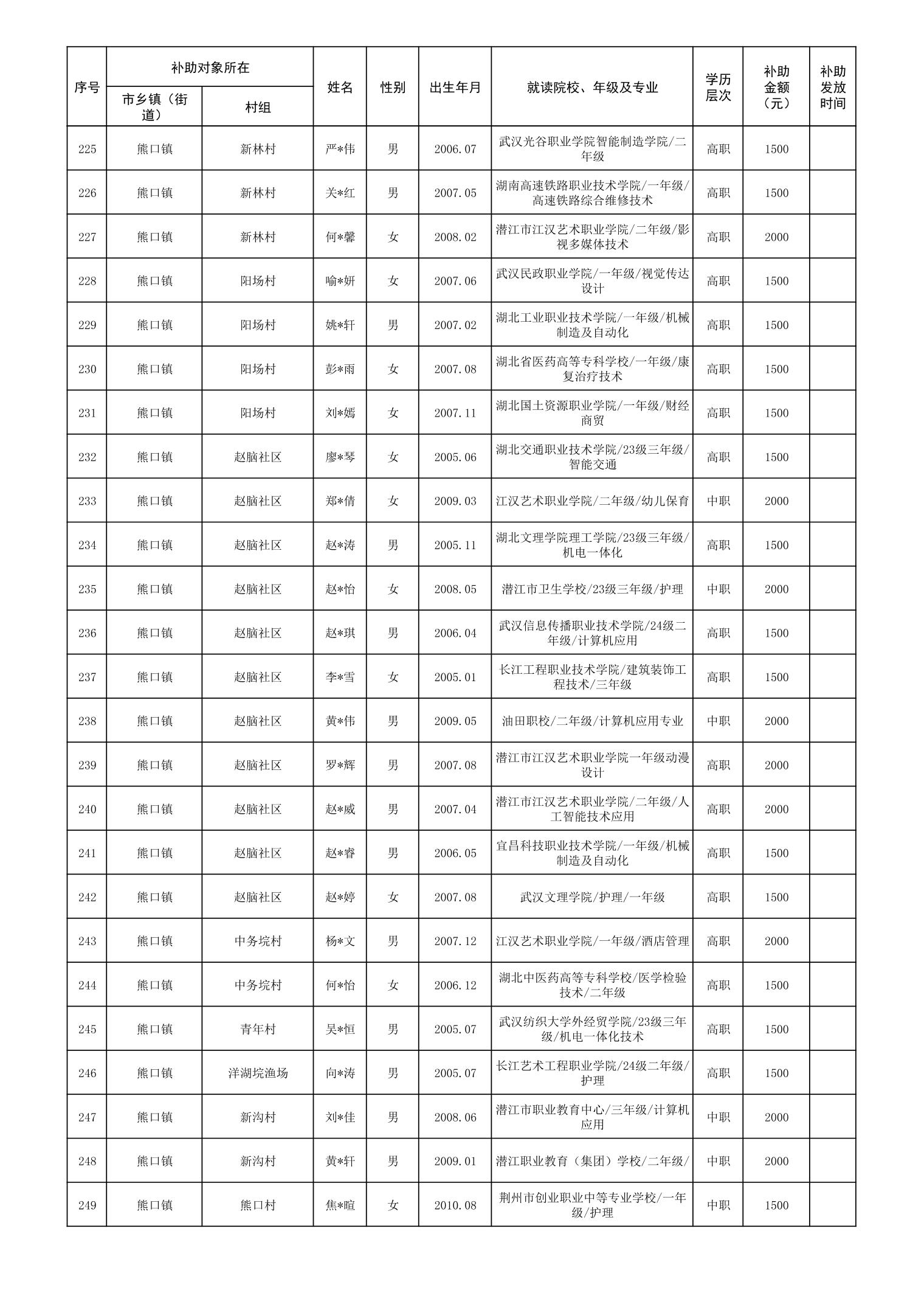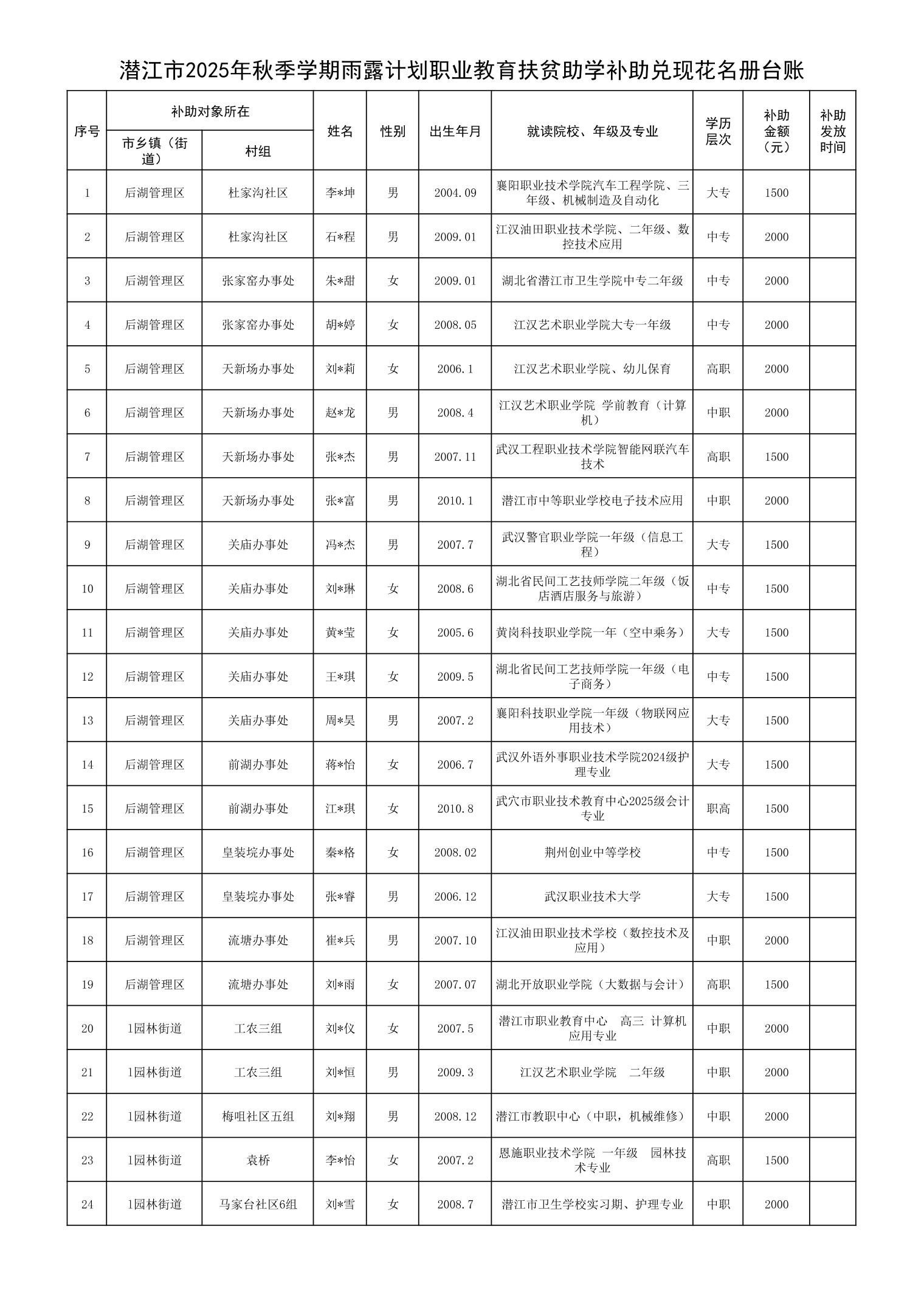 潜江市2025年秋季学期雨露计划职业教育扶贫助学补助兑现花名册台账