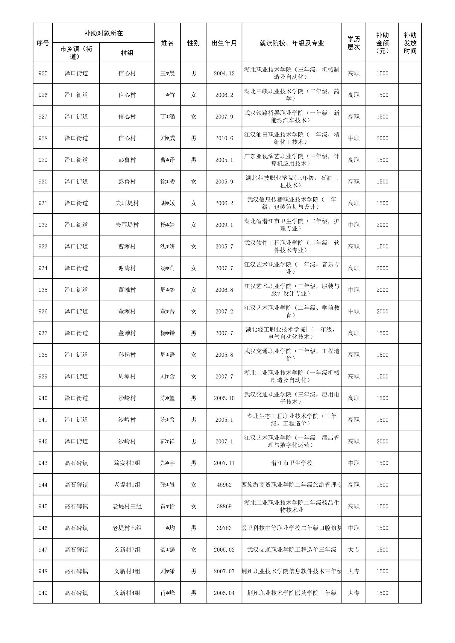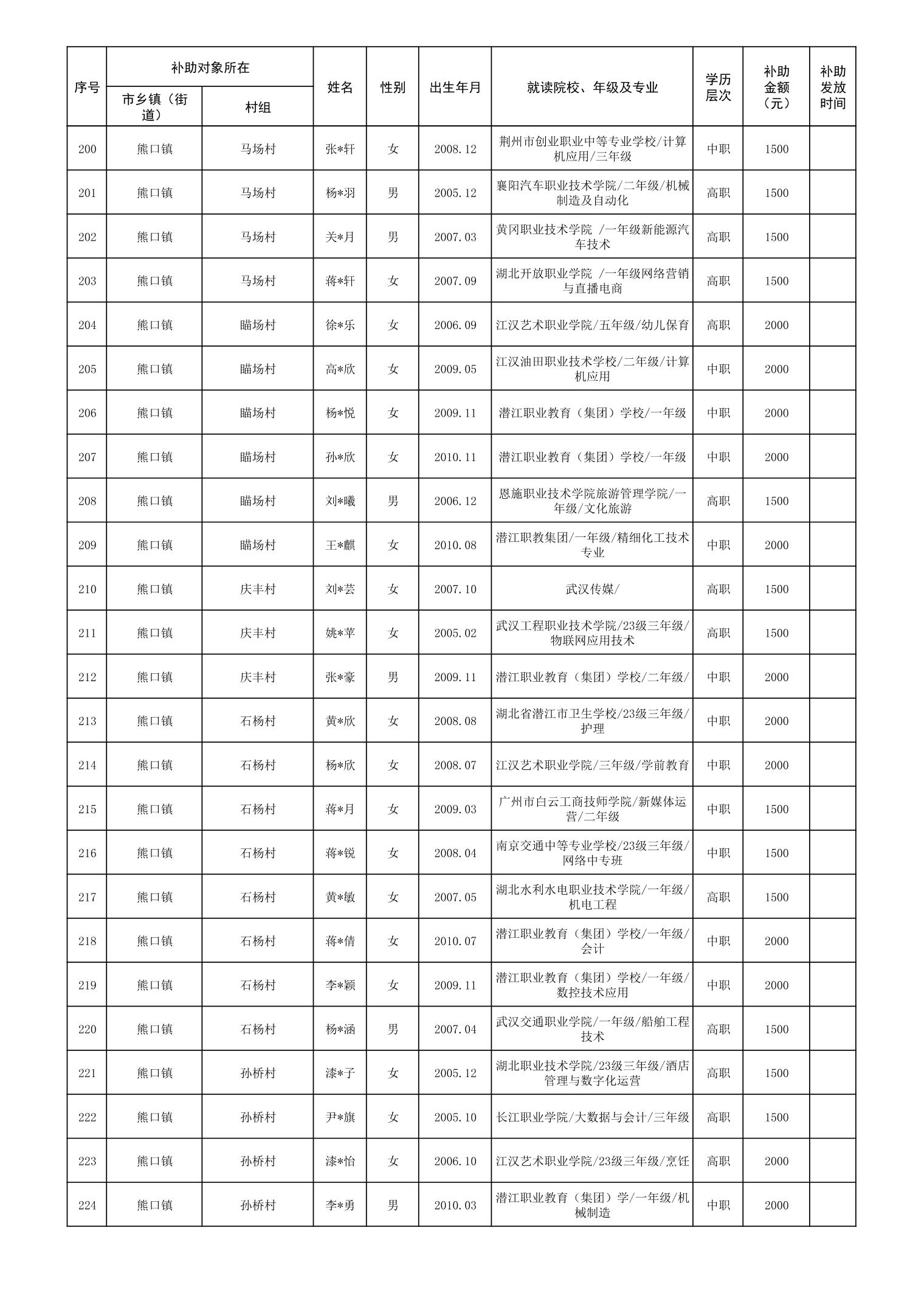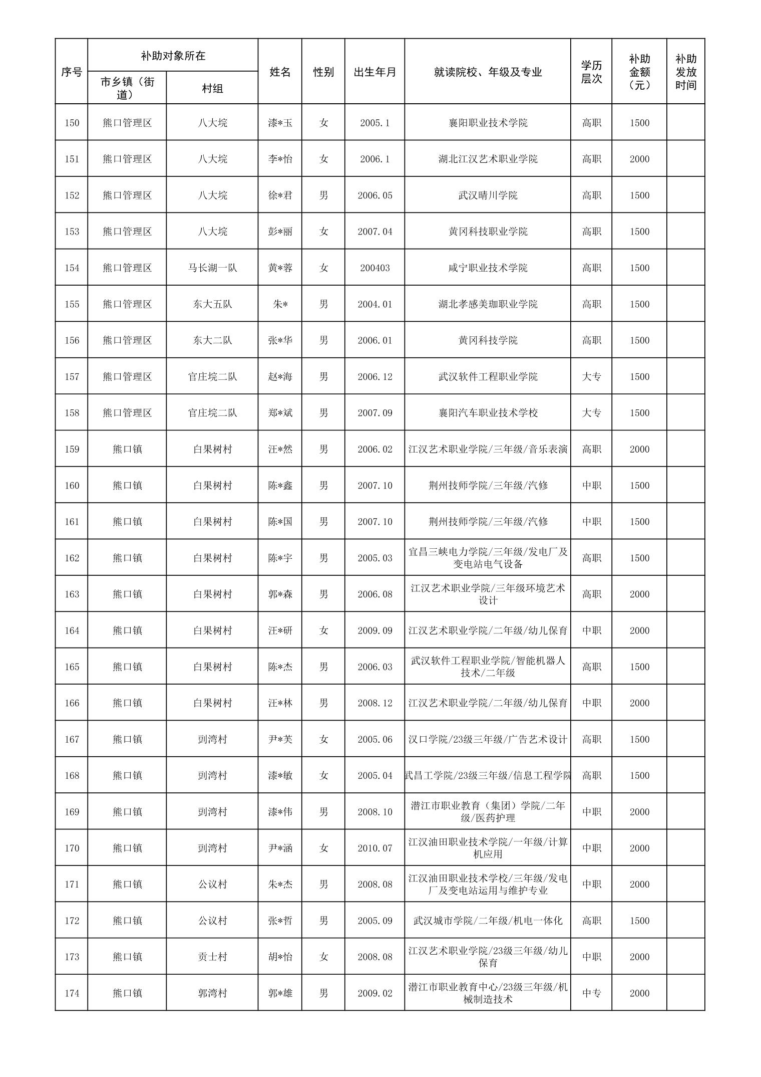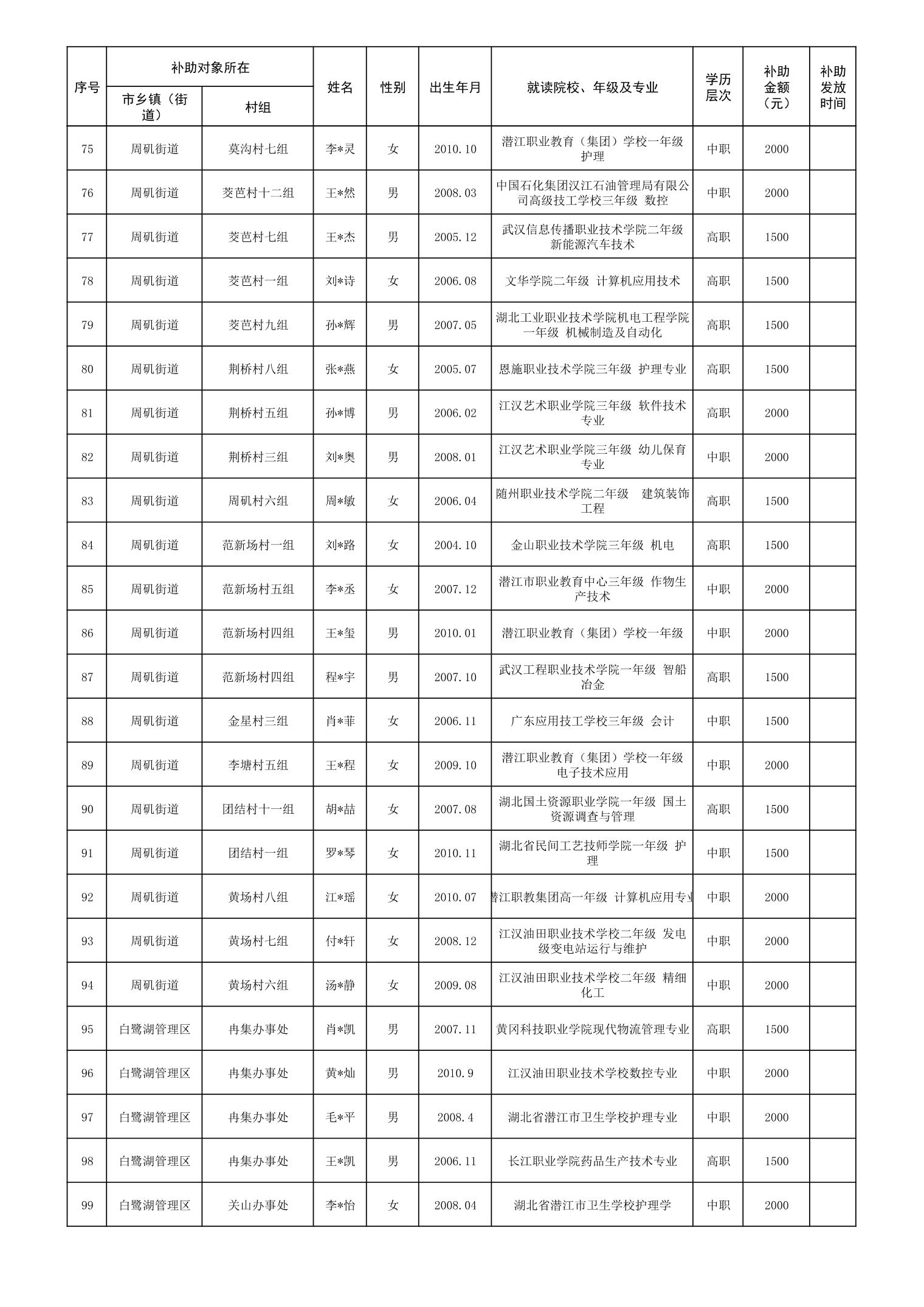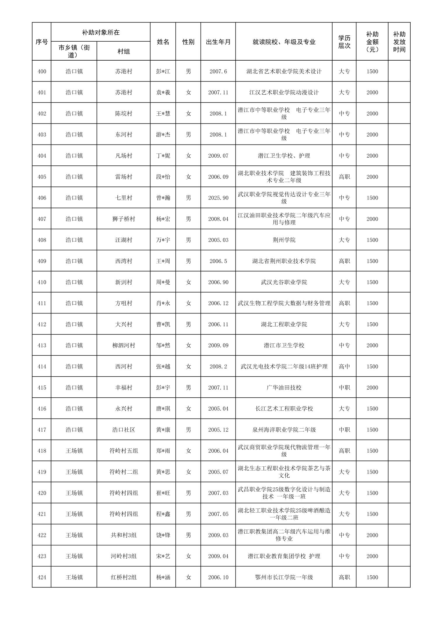 潜江市2025年秋季学期雨露计划职业教育扶贫助学补助兑现花名册台账