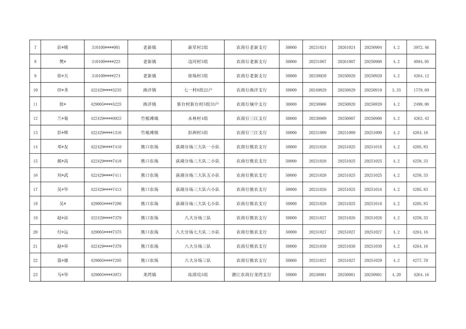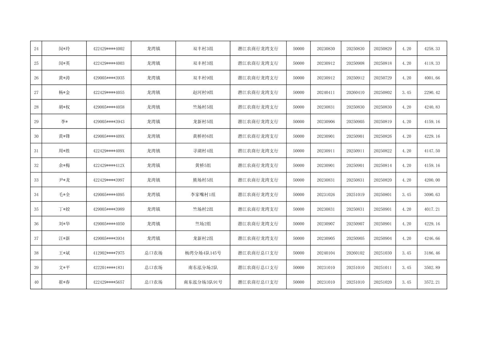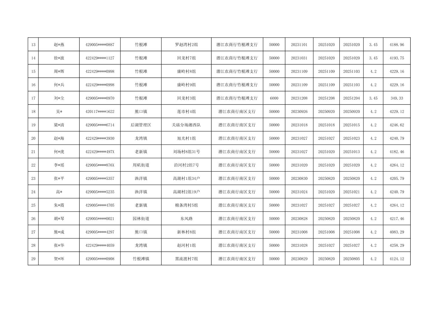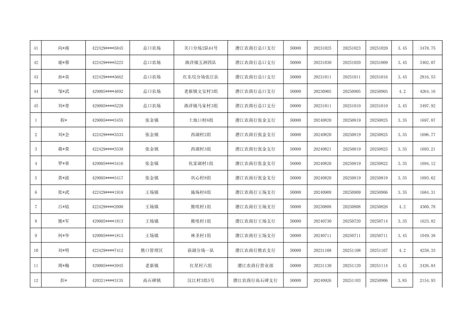 潜江2025年第四季度小额信贷贴息明细表