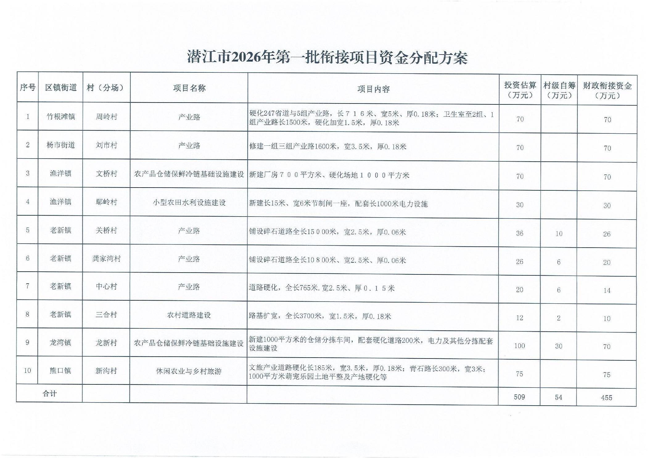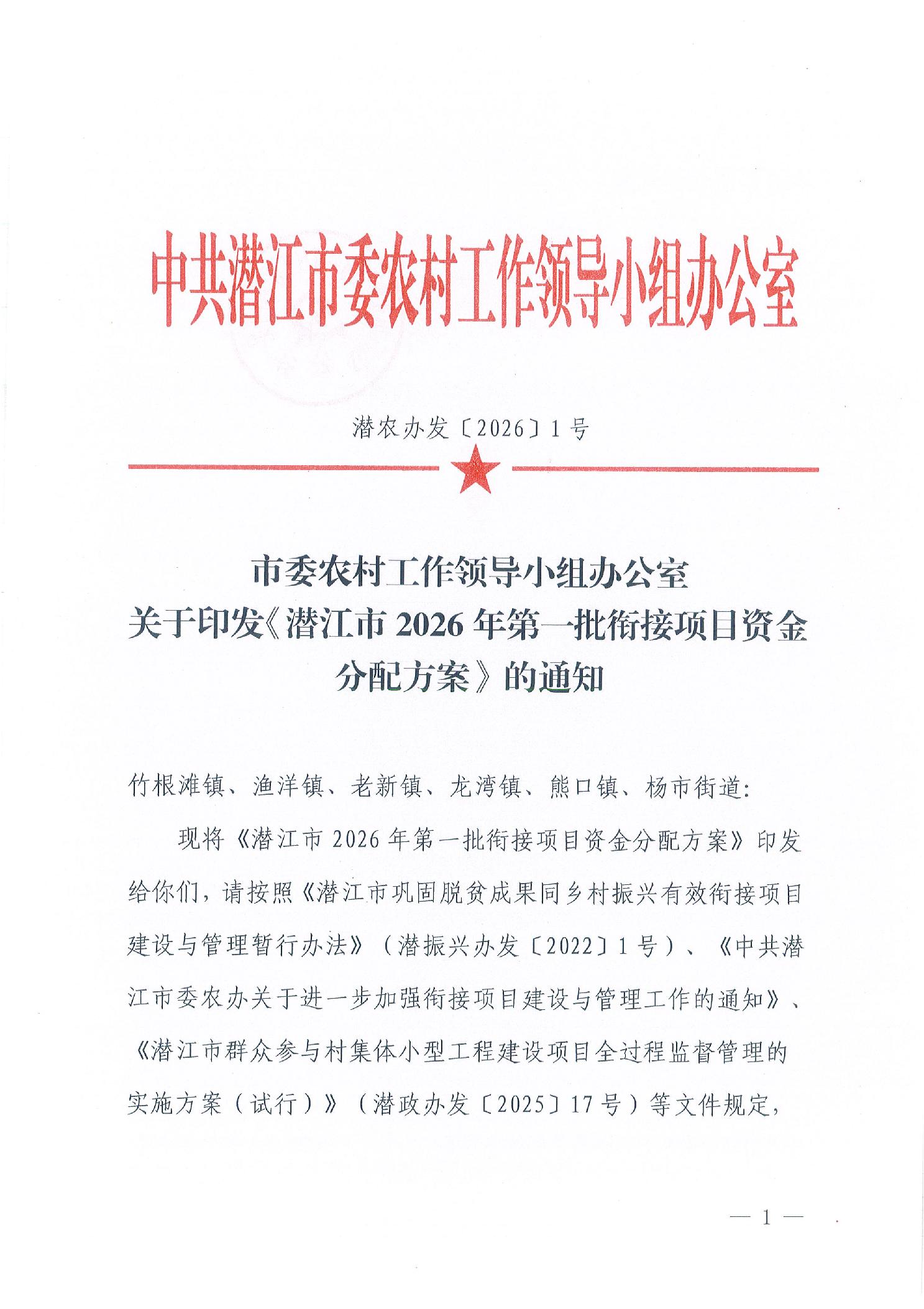市委农村工作领导小组办公室关于印发《潜江市2026年第一批衔接项目资金分配方案》的通知