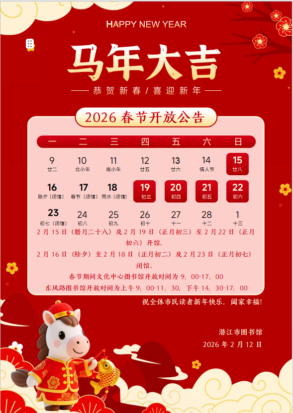 潜江市图书馆春节假期开放公告