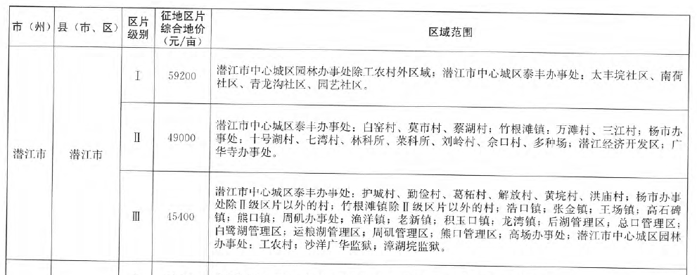 名 称: 潜江市征地区片综合地价标准