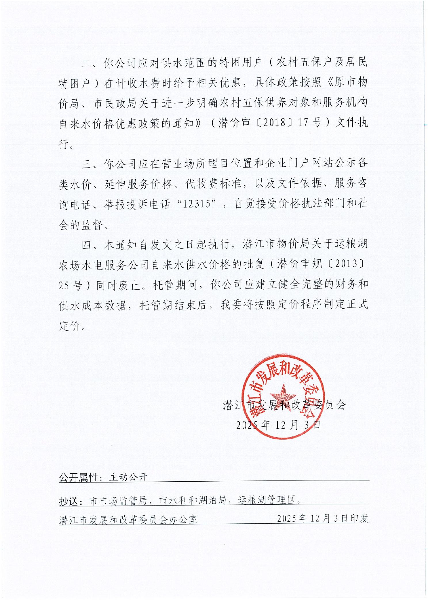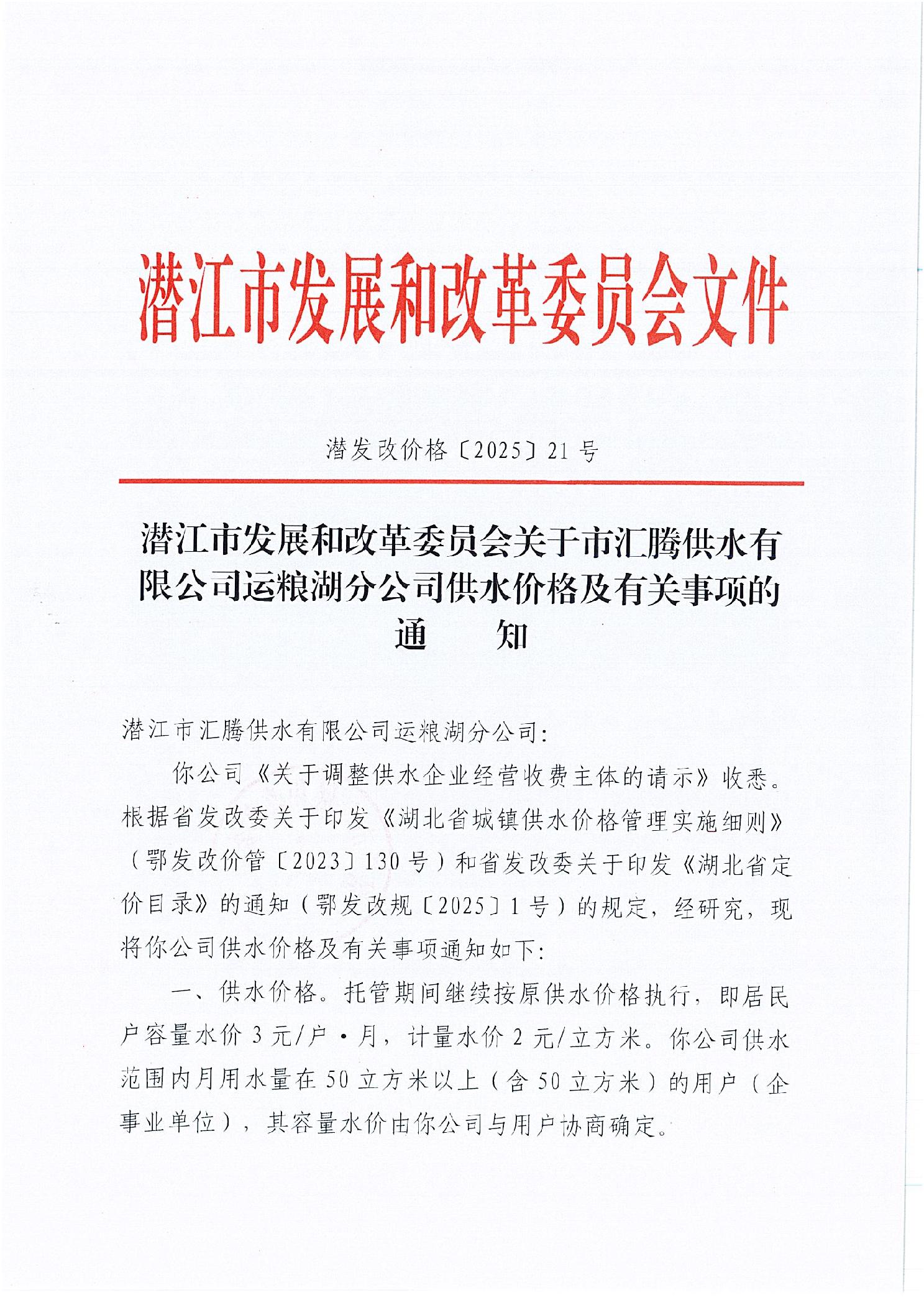 关于汇腾供水有限公司运粮湖分公司供水价格及有关事项的通知
