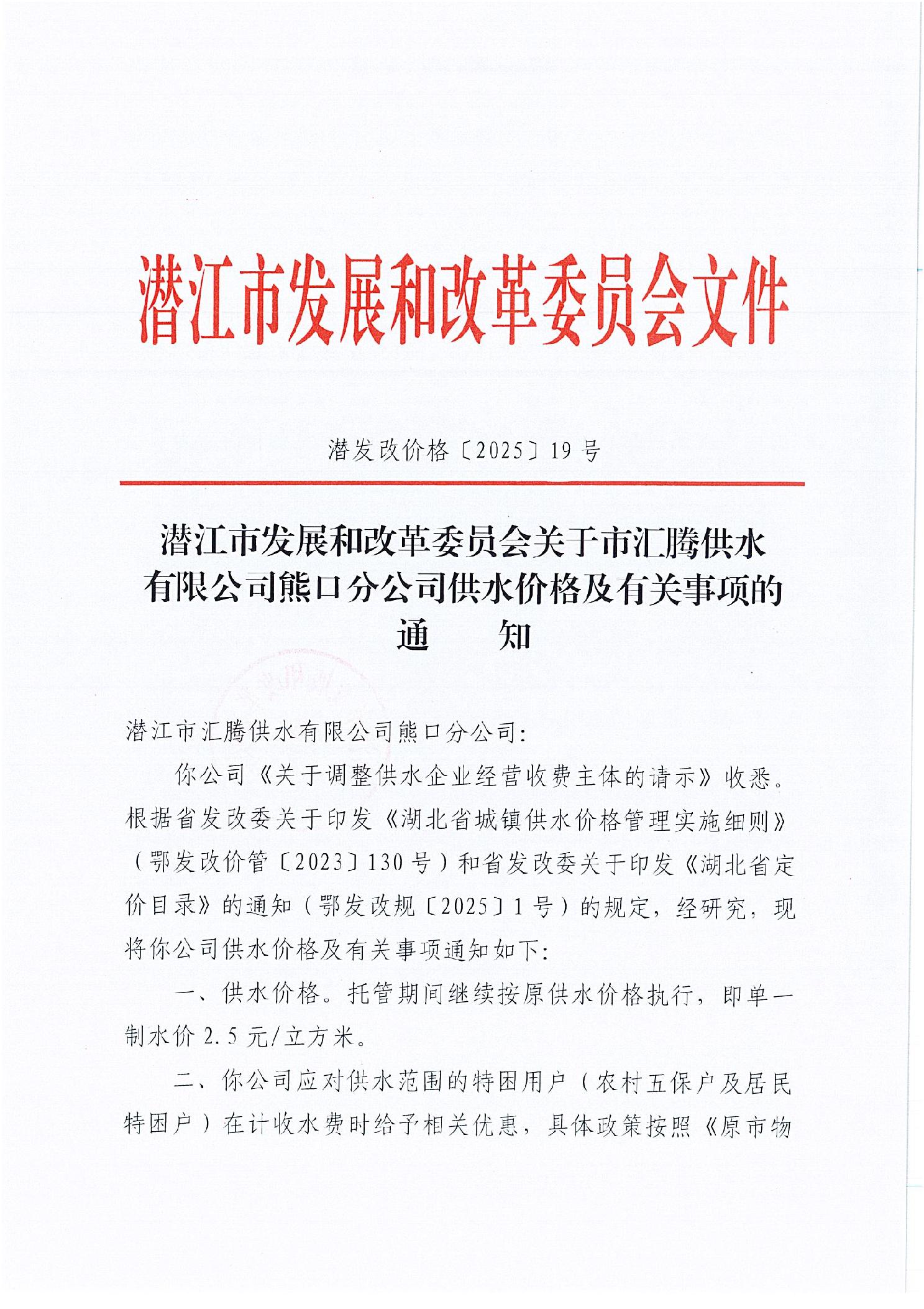 关于汇腾供水有限公司熊口分公司供水价格及有关事项的通知
