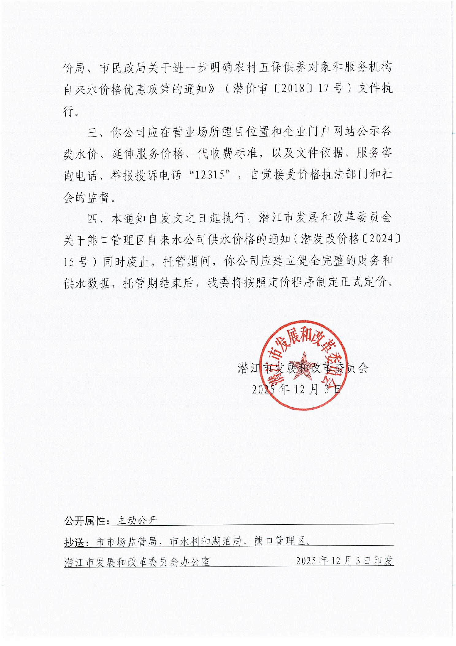名 称: 关于汇腾供水有限公司熊口分公司供水价格及有关事项的通知