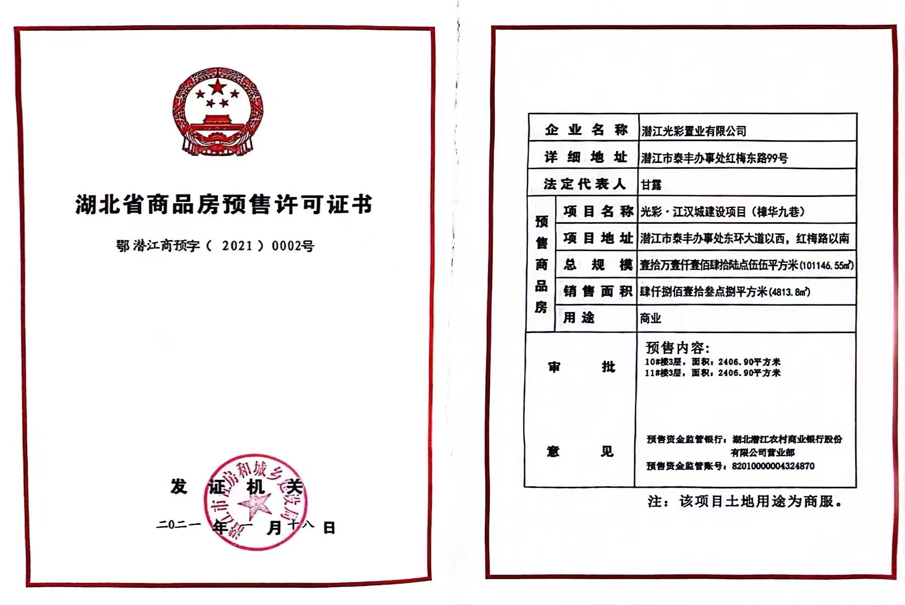 光彩·江汉城建设项目(樟华九巷)10#、11#预售许可证