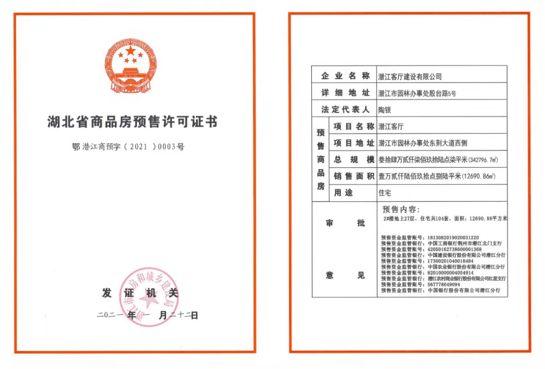 名 称: 潜江客厅2#预售许可证