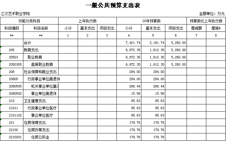 2020年, 江汉艺术职业学院公共财政预算拨款7421.74万元,其中:财政经费补助拨款收入7421.74万元。相应安排支出预算7421.74万元,其中:安排教育支出6872.35万元,社会保障和就业支出284.00万元,医疗卫生支出85.63万元,住房保障支出179.76万元。